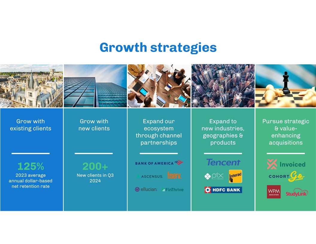 Growth strategies Grow with Grow with Expand our Expand to Pursue strategic existing clients new clients ecosystem new industries, & value- through channel geographies & enhancing partnerships products acquisitions 125% 200+ 2023 average New clients in Q3 annual dollar-based 2024 net retention rate