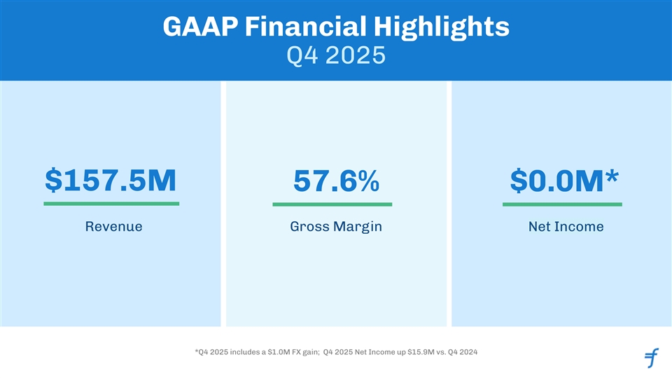 GAAP Financial Highlights Q4 2025 $157.5M 57.6% $0.0M* Revenue Gross Margin Net Income *Q4 2025 includes a $1.0M FX gain; Q4 2025 Net Income up $15.9M vs. Q4 2024