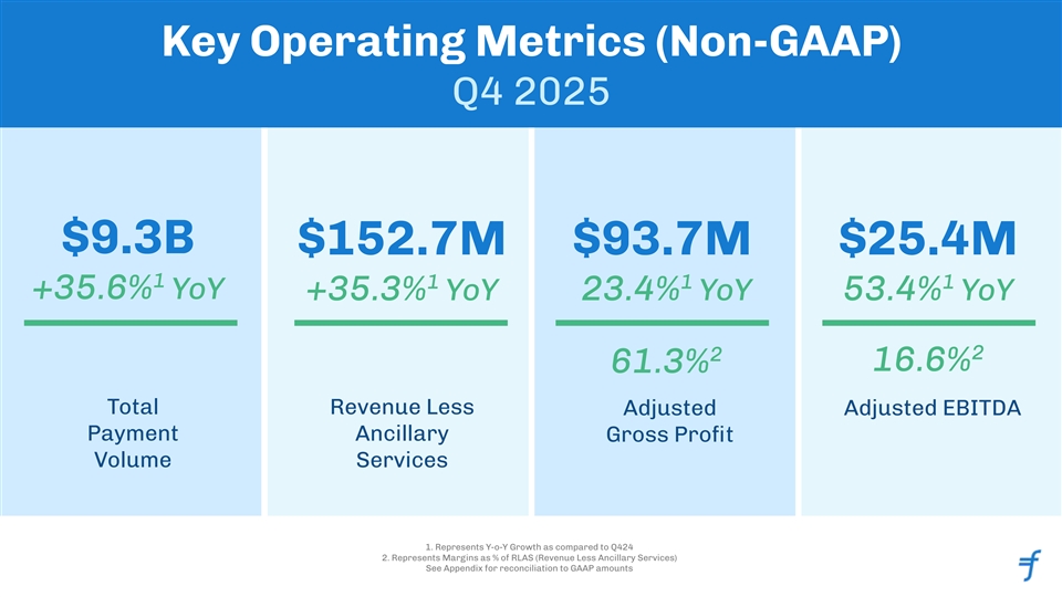 Key Operating Metrics (Non-GAAP) Q4 2025 $9.3B $152.7M $93.7M $25.4M 1 1 1 1 +35.6% YoY +35.3% YoY 23.4% YoY 53.4% YoY 2 2 16.6% 61.3% Total Revenue Less Adjusted Adjusted EBITDA Payment Ancillary Gross Profit Volume Services 1. Represents Y-o-Y Growth as compared to Q424 2. Represents Margins as % of RLAS (Revenue Less Ancillary Services) See Appendix for reconciliation to GAAP amounts