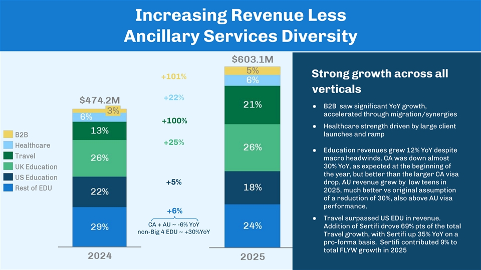 Increasing Revenue Less Ancillary Services Diversity Strong growth across all +101% verticals +22% ● B2B saw significant YoY growth, accelerated through migration/synergies +100% ● Healthcare strength driven by large client launches and ramp +25% ● Education revenues grew 12% YoY despite macro headwinds. CA was down almost 30% YoY, as expected at the beginning of the year, but better than the larger CA visa +5% drop. AU revenue grew by low teens in 2025, much better vs original assumption of a reduction of 30%, also above AU visa performance. +6% ● Travel surpassed US EDU in revenue. CA + AU ~ -6% YoY Addition of Sertifi drove 69% pts of the total non-Big 4 EDU ~ +30%YoY Travel growth, with Sertifi up 35% YoY on a pro-forma basis. Sertifi contributed 9% to total FLYW growth in 2025