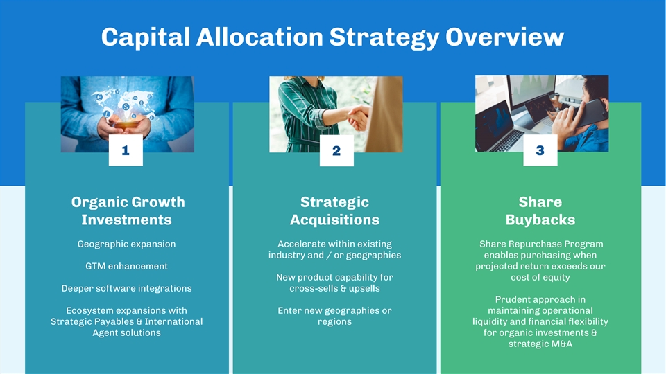 Capital Allocation Strategy Overview 13 2 Organic Growth Strategic Share Investments Acquisitions Buybacks Geographic expansion Accelerate within existing Share Repurchase Program industry and / or geographies enables purchasing when GTM enhancement projected return exceeds our New product capability for cost of equity Deeper software integrations cross-sells & upsells Prudent approach in Ecosystem expansions with Enter new geographies or maintaining operational Strategic Payables & International regions liquidity and financial flexibility Agent solutions for organic investments & strategic M&A