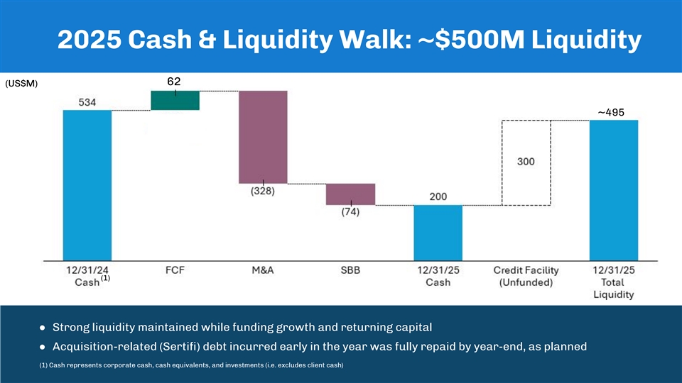 2025 Cash & Liquidity Walk: ~$500M Liquidity 62 (US$M) ~495 (1) ● Strong liquidity maintained while funding growth and returning capital ● Acquisition-related (Sertifi) debt incurred early in the year was fully repaid by year-end, as planned (1) Cash represents corporate cash, cash equivalents, and investments (i.e. excludes client cash)