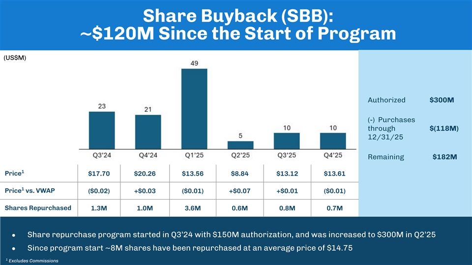 Share Buyback (SBB): ~$120M Since the Start of Program (US$M) Authorized $300M (-) Purchases through $(118M) 12/31/25 Remaining $182M 1 Price $17.70 $20.26 $13.56 $8.84 $13.12 $13.61 1 Price vs. VWAP ($0.02) +$0.03 ($0.01) +$0.07 +$0.01 ($0.01) Shares Repurchased 1.3M 1.0M 3.6M 0.6M 0.8M 0.7M ● Share repurchase program started in Q3’24 with $150M authorization, and was increased to $300M in Q2’25 ● Since program start ~8M shares have been repurchased at an average price of $14.75 1 Excludes Commissions