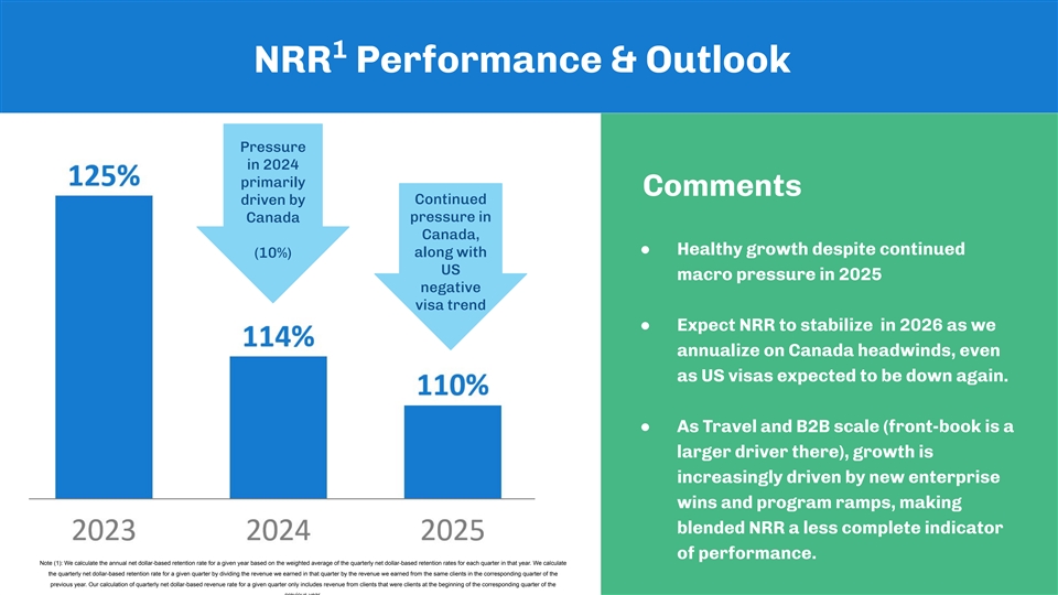1 NRR Performance & Outlook Pressure in 2024 primarily Comments Continued driven by pressure in Canada Canada, ● Healthy growth despite continued along with (10%) US macro pressure in 2025 negative visa trend ● Expect NRR to stabilize in 2026 as we annualize on Canada headwinds, even as US visas expected to be down again. ● As Travel and B2B scale (front-book is a larger driver there), growth is increasingly driven by new enterprise wins and program ramps, making blended NRR a less complete indicator of performance. Note (1): We calculate the annual net dollar-based retention rate for a given year based on the weighted average of the quarterly net dollar-based retention rates for each quarter in that year. We calculate the quarterly net dollar-based retention rate for a given quarter by dividing the revenue we earned in that quarter by the revenue we earned from the same clients in the corresponding quarter of the previous year. Our calculation of quarterly net dollar-based revenue rate for a given quarter only includes revenue from clients that were clients at the beginning of the corresponding quarter of the previous year.