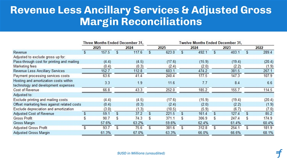 Key Operating Metrics (Non-GAAP) FY 2025 $37.6B $603.1M $381.6M $120.6M 1 1 1 1 +26.4% YoY +27.1% YoY +21.8% YoY +55.0% YoY 2 2 63.3% 20.0% Revenue Less Total Adjusted Adjusted EBITDA Ancillary Payment Gross Profit Services Volume 1. Represents Y-o-Y Growth as compared to FY24 2. Represents Margins as % of RLAS (Revenue Less Ancillary Services) See Appendix for reconciliation to GAAP amounts