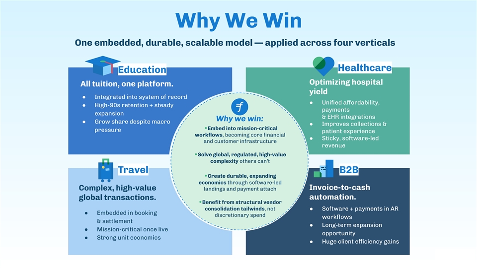 Why We Win One embedded, durable, scalable model — applied across four verticals Healthcare Education Optimizing hospital All tuition, one platform. yield ● Integrated into system of record ● Unified affordability, ● High-90s retention + steady payments expansion & EHR integrations Why we win: ● Grow share despite macro ● Improves collections & •Embed into mission-critical pressure patient experience workflows, becoming core financial ● Sticky, software-led and customer infrastructure revenue •Solve global, regulated, high-value complexity others can’t Travel B2B •Create durable, expanding economics through software-led Invoice-to-cash Complex, high-value landings and payment attach global transactions. automation. •Benefit from structural vendor consolidation tailwinds, not ● Software + payments in AR ● Embedded in booking discretionary spend workflows & settlement ● Long-term expansion ● Mission-critical once live opportunity ● Strong unit economics ● Huge client efficiency gains