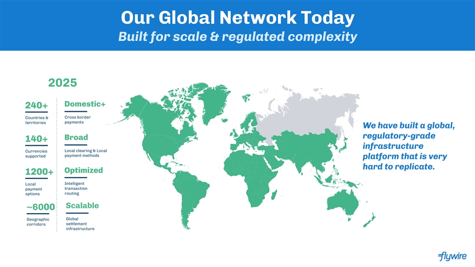 Our Global Network Today Built for scale & regulated complexity 2025 Domestic+ 240+ Cross border Countries & territories payments We have built a global, regulatory-grade Broad 140+ infrastructure Local clearing & Local Currencies payment methods supported platform that is very hard to replicate. Optimized 1200+ Intelligent Local transaction payment options routing Scalable ~6000 Global Geographic settlement corridors infrastructure