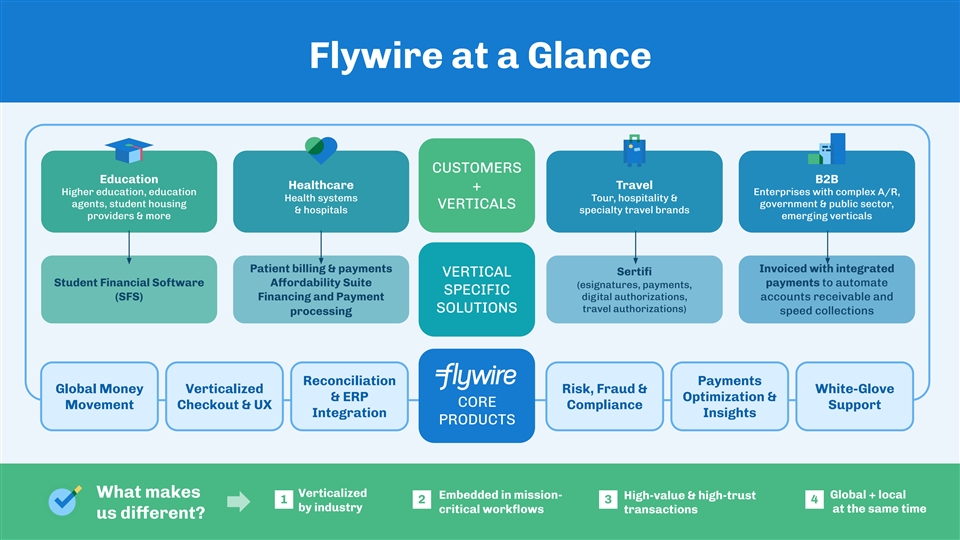 Flywire at a Glance CUSTOMERS Education B2B Healthcare Travel + Higher education, education Enterprises with complex A/R, Health systems Tour, hospitality & agents, student housing government & public sector, VERTICALS & hospitals specialty travel brands providers & more emerging verticals Patient billing & payments Invoiced with integrated Sertifi VERTICAL Student Financial Software Aordabi ff lity Suite payments to automate (esignatures, payments, SPECIFIC (SFS) Financing and Payment digital authorizations, accounts receivable and travel authorizations) SOLUTIONS processing speed collections Reconciliation Payments Global Money Verticalized Risk, Fraud & White-Glove & ERP Optimization & CORE Movement Checkout & UX Compliance Support Integration Insights PRODUCTS What makes Verticalized Embedded in mission- Global + local High-value & high-trust 1 2 3 4 by industry critical workflows transactions at the same time us dieren ff t?