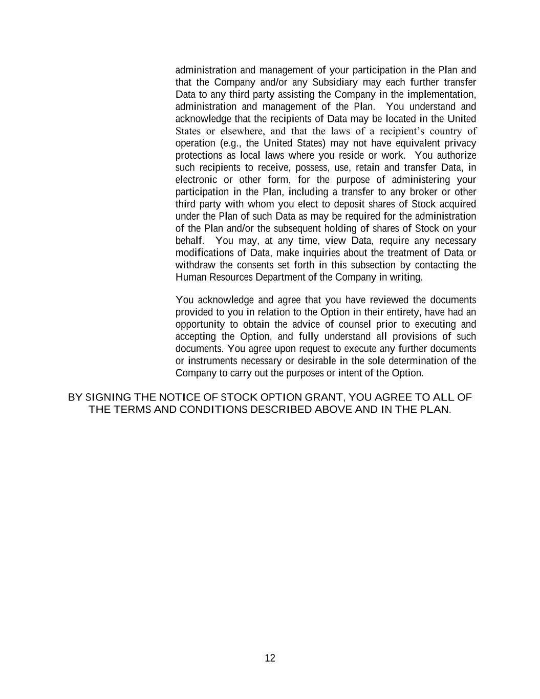 12 administration and management of your participation in the Plan and that the Company and/or any Subsidiary may each further transfer Data to any third party assisting the Company in the implementation, administration and management of the Plan. You understand and acknowledge that the recipients of Data may be located in the United States or elsewhere, and that the laws of a recipient’s country of operation (e.g., the United States) may not have equivalent privacy protections as local laws where you reside or work. You authorize such recipients to receive, possess, use, retain and transfer Data, in electronic or other form, for the purpose of administering your participation in the Plan, including a transfer to any broker or other third party with whom you elect to deposit shares of Stock acquired under the Plan of such Data as may be required for the administration of the Plan and/or the subsequent holding of shares of Stock on your behalf. You may, at any time, view Data, require any necessary modifications of Data, make inquiries about the treatment of Data or withdraw the consents set forth in this subsection by contacting the Human Resources Department of the Company in writing. You acknowledge and agree that you have reviewed the documents provided to you in relation to the Option in their entirety, have had an opportunity to obtain the advice of counsel prior to executing and accepting the Option, and fully understand all provisions of such documents. You agree upon request to execute any further documents or instruments necessary or desirable in the sole determination of the Company to carry out the purposes or intent of the Option. BY SIGNING THE NOTICE OF STOCK OPTION GRANT, YOU AGREE TO ALL OF THE TERMS AND CONDITIONS DESCRIBED ABOVE AND IN THE PLAN.