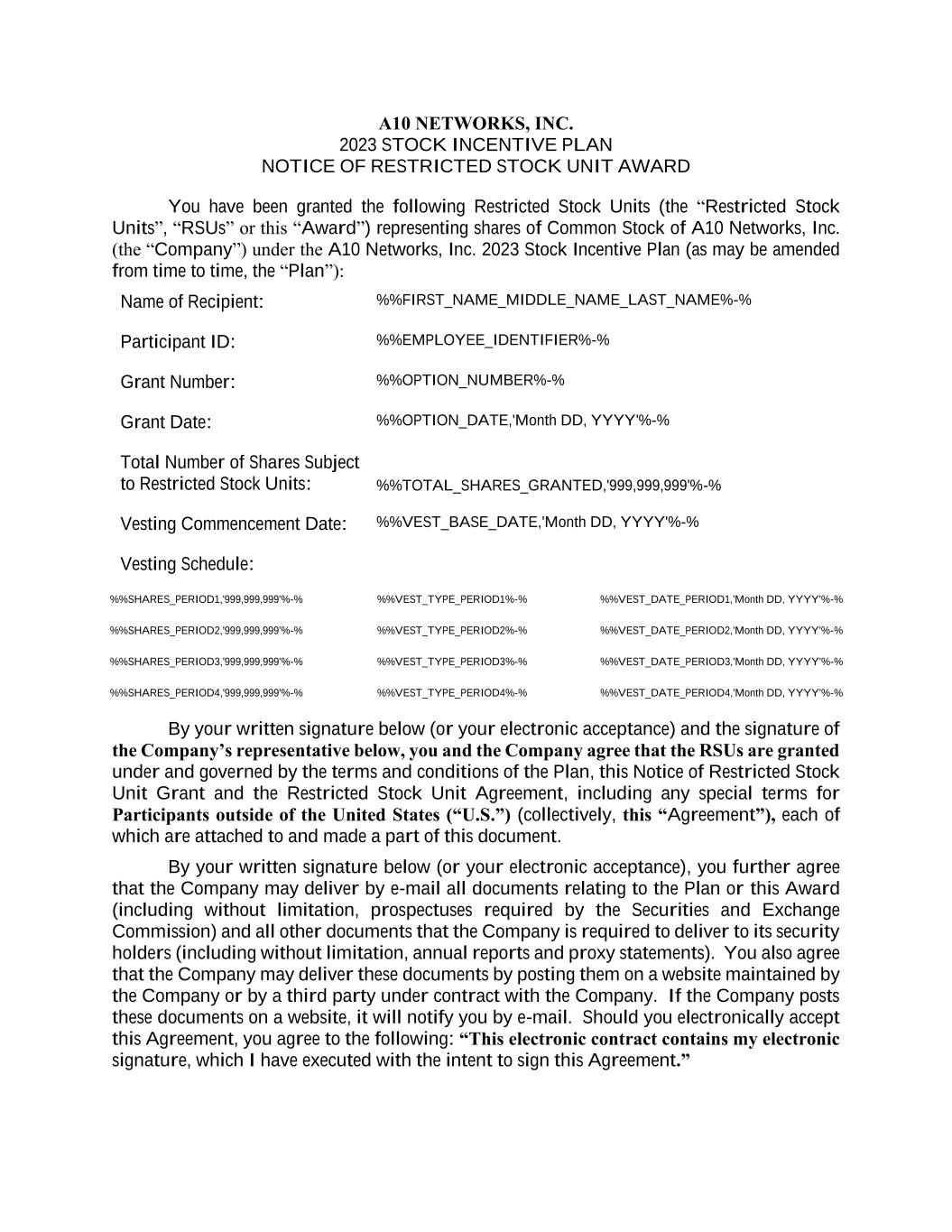 A10 NETWORKS, INC. 2023 STOCK INCENTIVE PLAN NOTICE OF RESTRICTED STOCK UNIT AWARD You have been granted the following Restricted Stock Units (the “Restricted Stock Units”, “RSUs” or this “Award”) representing shares of Common Stock of A10 Networks, Inc. (the “Company”) under the A10 Networks, Inc. 2023 Stock Incentive Plan (as may be amended from time to time, the “Plan”): Name of Recipient: %%FIRST_NAME_MIDDLE_NAME_LAST_NAME%-% Participant ID: %%EMPLOYEE_IDENTIFIER%-% Grant Number: %%OPTION_NUMBER%-% Grant Date: %%OPTION_DATE,'Month DD, YYYY'%-% Total Number of Shares Subject to Restricted Stock Units: %%TOTAL_SHARES_GRANTED,'999,999,999'%-% Vesting Commencement Date: %%VEST_BASE_DATE,'Month DD, YYYY'%-% Vesting Schedule: %%SHARES_PERIOD1,'999,999,999'%-% %%VEST_TYPE_PERIOD1%-% %%VEST_DATE_PERIOD1,'Month DD, YYYY'%-% %%SHARES_PERIOD2,'999,999,999'%-% %%VEST_TYPE_PERIOD2%-% %%VEST_DATE_PERIOD2,'Month DD, YYYY'%-% %%SHARES_PERIOD3,'999,999,999'%-% %%VEST_TYPE_PERIOD3%-% %%VEST_DATE_PERIOD3,'Month DD, YYYY'%-% %%SHARES_PERIOD4,'999,999,999'%-% %%VEST_TYPE_PERIOD4%-% %%VEST_DATE_PERIOD4,'Month DD, YYYY'%-% By your written signature below (or your electronic acceptance) and the signature of the Company’s representative below, you and the Company agree that the RSUs are granted under and governed by the terms and conditions of the Plan, this Notice of Restricted Stock Unit Grant and the Restricted Stock Unit Agreement, including any special terms for Participants outside of the United States (“U.S.”) (collectively, this “Agreement”), each of which are attached to and made a part of this document. By your written signature below (or your electronic acceptance), you further agree that the Company may deliver by e-mail all documents relating to the Plan or this Award (including without limitation, prospectuses required by the Securities and Exchange Commission) and all other documents that the Company is required to deliver to its security holders (including without limitation, annual reports and proxy statements). You also agree that the Company may deliver these documents by posting them on a website maintained by the Company or by a third party under contract with the Company. If the Company posts these documents on a website, it will notify you by e-mail. Should you electronically accept this Agreement, you agree to the following: “This electronic contract contains my electronic signature, which I have executed with the intent to sign this Agreement.”