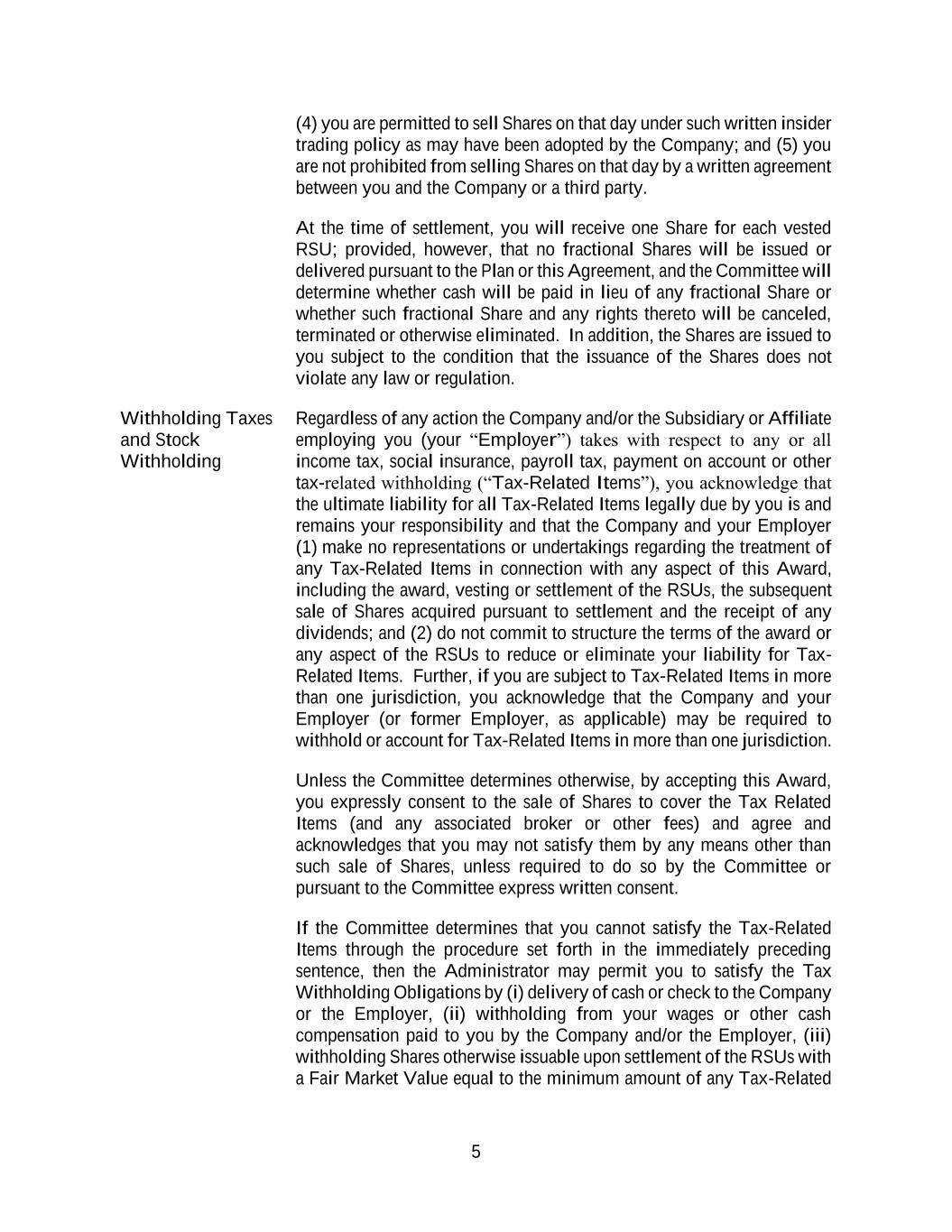 5 (4) you are permitted to sell Shares on that day under such written insider trading policy as may have been adopted by the Company; and (5) you are not prohibited from selling Shares on that day by a written agreement between you and the Company or a third party. At the time of settlement, you will receive one Share for each vested RSU; provided, however, that no fractional Shares will be issued or delivered pursuant to the Plan or this Agreement, and the Committee will determine whether cash will be paid in lieu of any fractional Share or whether such fractional Share and any rights thereto will be canceled, terminated or otherwise eliminated. In addition, the Shares are issued to you subject to the condition that the issuance of the Shares does not violate any law or regulation. Withholding Taxes and Stock Withholding Regardless of any action the Company and/or the Subsidiary or Affiliate employing you (your “Employer”) takes with respect to any or all income tax, social insurance, payroll tax, payment on account or other tax-related withholding (“Tax-Related Items”), you acknowledge that the ultimate liability for all Tax-Related Items legally due by you is and remains your responsibility and that the Company and your Employer (1) make no representations or undertakings regarding the treatment of any Tax-Related Items in connection with any aspect of this Award, including the award, vesting or settlement of the RSUs, the subsequent sale of Shares acquired pursuant to settlement and the receipt of any dividends; and (2) do not commit to structure the terms of the award or any aspect of the RSUs to reduce or eliminate your liability for Tax- Related Items. Further, if you are subject to Tax-Related Items in more than one jurisdiction, you acknowledge that the Company and your Employer (or former Employer, as applicable) may be required to withhold or account for Tax-Related Items in more than one jurisdiction. Unless the Committee determines otherwise, by accepting this Award, you expressly consent to the sale of Shares to cover the Tax Related Items (and any associated broker or other fees) and agree and acknowledges that you may not satisfy them by any means other than such sale of Shares, unless required to do so by the Committee or pursuant to the Committee express written consent. If the Committee determines that you cannot satisfy the Tax-Related Items through the procedure set forth in the immediately preceding sentence, then the Administrator may permit you to satisfy the Tax Withholding Obligations by (i) delivery of cash or check to the Company or the Employer, (ii) withholding from your wages or other cash compensation paid to you by the Company and/or the Employer, (iii) withholding Shares otherwise issuable upon settlement of the RSUs with a Fair Market Value equal to the minimum amount of any Tax-Related
