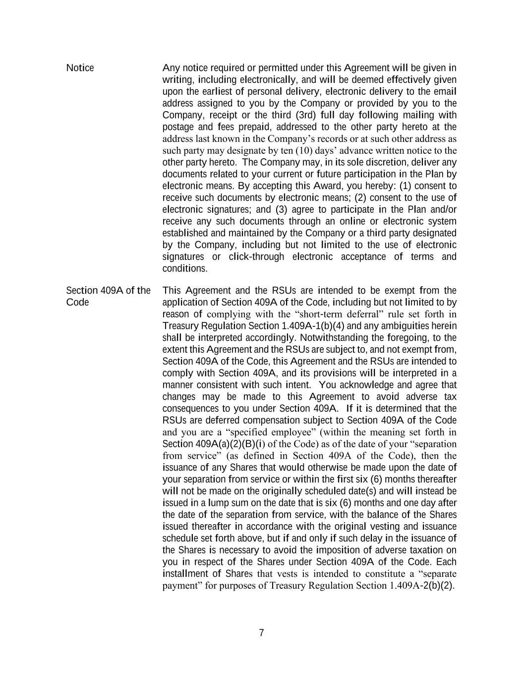 7 Notice Any notice required or permitted under this Agreement will be given in writing, including electronically, and will be deemed effectively given upon the earliest of personal delivery, electronic delivery to the email address assigned to you by the Company or provided by you to the Company, receipt or the third (3rd) full day following mailing with postage and fees prepaid, addressed to the other party hereto at the address last known in the Company’s records or at such other address as such party may designate by ten (10) days’ advance written notice to the other party hereto. The Company may, in its sole discretion, deliver any documents related to your current or future participation in the Plan by electronic means. By accepting this Award, you hereby: (1) consent to receive such documents by electronic means; (2) consent to the use of electronic signatures; and (3) agree to participate in the Plan and/or receive any such documents through an online or electronic system established and maintained by the Company or a third party designated by the Company, including but not limited to the use of electronic signatures or click-through electronic acceptance of terms and conditions. Section 409A of the Code This Agreement and the RSUs are intended to be exempt from the application of Section 409A of the Code, including but not limited to by reason of complying with the “short-term deferral” rule set forth in Treasury Regulation Section 1.409A-1(b)(4) and any ambiguities herein shall be interpreted accordingly. Notwithstanding the foregoing, to the extent this Agreement and the RSUs are subject to, and not exempt from, Section 409A of the Code, this Agreement and the RSUs are intended to comply with Section 409A, and its provisions will be interpreted in a manner consistent with such intent. You acknowledge and agree that changes may be made to this Agreement to avoid adverse tax consequences to you under Section 409A. If it is determined that the RSUs are deferred compensation subject to Section 409A of the Code and you are a “specified employee” (within the meaning set forth in Section 409A(a)(2)(B)(i) of the Code) as of the date of your “separation from service” (as defined in Section 409A of the Code), then the issuance of any Shares that would otherwise be made upon the date of your separation from service or within the first six (6) months thereafter will not be made on the originally scheduled date(s) and will instead be issued in a lump sum on the date that is six (6) months and one day after the date of the separation from service, with the balance of the Shares issued thereafter in accordance with the original vesting and issuance schedule set forth above, but if and only if such delay in the issuance of the Shares is necessary to avoid the imposition of adverse taxation on you in respect of the Shares under Section 409A of the Code. Each installment of Shares that vests is intended to constitute a “separate payment” for purposes of Treasury Regulation Section 1.409A-2(b)(2).