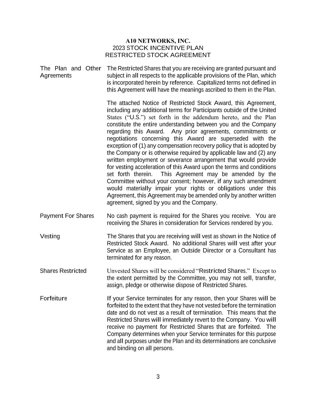 3 A10 NETWORKS, INC. 2023 STOCK INCENTIVE PLAN RESTRICTED STOCK AGREEMENT The Plan and Other Agreements The Restricted Shares that you are receiving are granted pursuant and subject in all respects to the applicable provisions of the Plan, which is incorporated herein by reference. Capitalized terms not defined in this Agreement will have the meanings ascribed to them in the Plan. The attached Notice of Restricted Stock Award, this Agreement, including any additional terms for Participants outside of the United States (“U.S.”) set forth in the addendum hereto, and the Plan constitute the entire understanding between you and the Company regarding this Award. Any prior agreements, commitments or negotiations concerning this Award are superseded with the exception of (1) any compensation recovery policy that is adopted by the Company or is otherwise required by applicable law and (2) any written employment or severance arrangement that would provide for vesting acceleration of this Award upon the terms and conditions set forth therein. This Agreement may be amended by the Committee without your consent; however, if any such amendment would materially impair your rights or obligations under this Agreement, this Agreement may be amended only by another written agreement, signed by you and the Company. Payment For Shares No cash payment is required for the Shares you receive. You are receiving the Shares in consideration for Services rendered by you. Vesting The Shares that you are receiving will vest as shown in the Notice of Restricted Stock Award. No additional Shares will vest after your Service as an Employee, an Outside Director or a Consultant has terminated for any reason. Shares Restricted Unvested Shares will be considered “Restricted Shares.” Except to the extent permitted by the Committee, you may not sell, transfer, assign, pledge or otherwise dispose of Restricted Shares. Forfeiture If your Service terminates for any reason, then your Shares will be forfeited to the extent that they have not vested before the termination date and do not vest as a result of termination. This means that the Restricted Shares will immediately revert to the Company. You will receive no payment for Restricted Shares that are forfeited. The Company determines when your Service terminates for this purpose and all purposes under the Plan and its determinations are conclusive and binding on all persons.