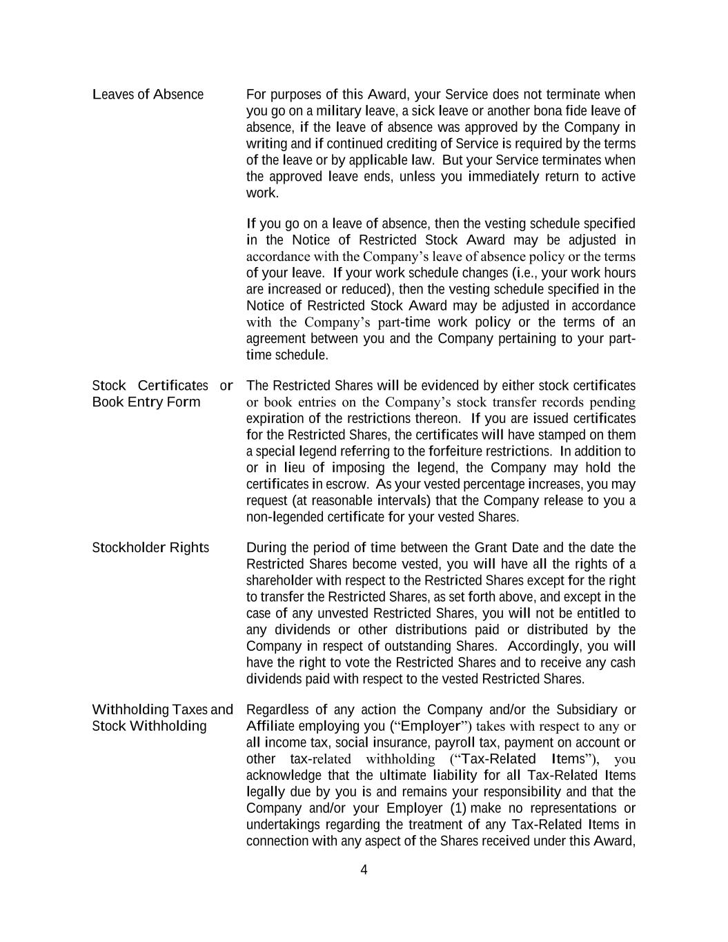 4 Leaves of Absence For purposes of this Award, your Service does not terminate when you go on a military leave, a sick leave or another bona fide leave of absence, if the leave of absence was approved by the Company in writing and if continued crediting of Service is required by the terms of the leave or by applicable law. But your Service terminates when the approved leave ends, unless you immediately return to active work. If you go on a leave of absence, then the vesting schedule specified in the Notice of Restricted Stock Award may be adjusted in accordance with the Company’s leave of absence policy or the terms of your leave. If your work schedule changes (i.e., your work hours are increased or reduced), then the vesting schedule specified in the Notice of Restricted Stock Award may be adjusted in accordance with the Company’s part-time work policy or the terms of an agreement between you and the Company pertaining to your part- time schedule. Stock Certificates or Book Entry Form The Restricted Shares will be evidenced by either stock certificates or book entries on the Company’s stock transfer records pending expiration of the restrictions thereon. If you are issued certificates for the Restricted Shares, the certificates will have stamped on them a special legend referring to the forfeiture restrictions. In addition to or in lieu of imposing the legend, the Company may hold the certificates in escrow. As your vested percentage increases, you may request (at reasonable intervals) that the Company release to you a non-legended certificate for your vested Shares. Stockholder Rights During the period of time between the Grant Date and the date the Restricted Shares become vested, you will have all the rights of a shareholder with respect to the Restricted Shares except for the right to transfer the Restricted Shares, as set forth above, and except in the case of any unvested Restricted Shares, you will not be entitled to any dividends or other distributions paid or distributed by the Company in respect of outstanding Shares. Accordingly, you will have the right to vote the Restricted Shares and to receive any cash dividends paid with respect to the vested Restricted Shares. Withholding Taxes and Stock Withholding Regardless of any action the Company and/or the Subsidiary or Affiliate employing you (“Employer”) takes with respect to any or all income tax, social insurance, payroll tax, payment on account or other tax-related withholding (“Tax-Related Items”), you acknowledge that the ultimate liability for all Tax-Related Items legally due by you is and remains your responsibility and that the Company and/or your Employer (1) make no representations or undertakings regarding the treatment of any Tax-Related Items in connection with any aspect of the Shares received under this Award,