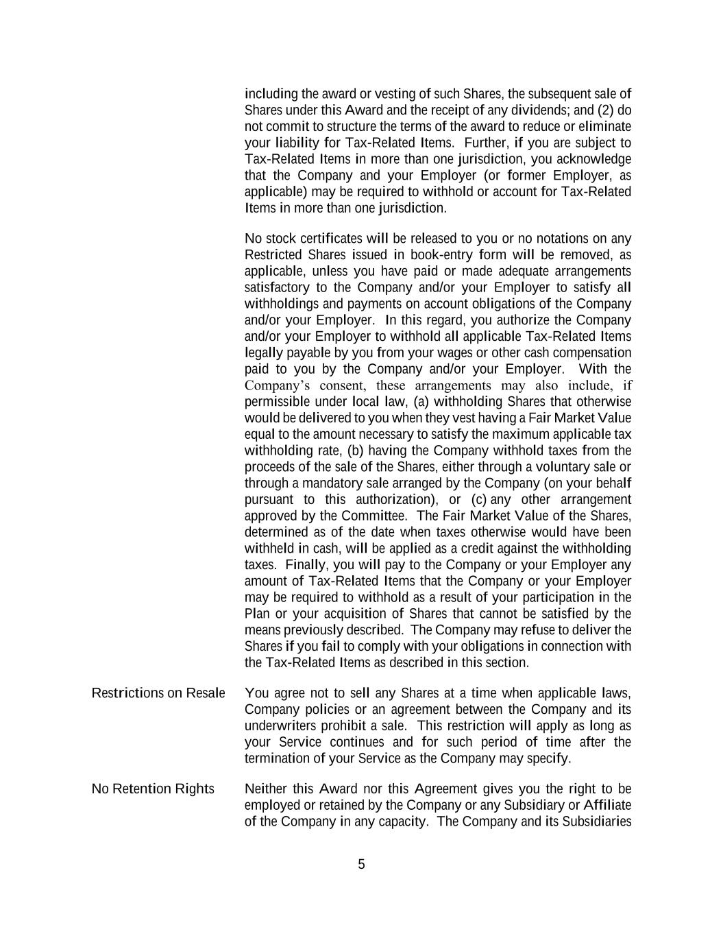 5 including the award or vesting of such Shares, the subsequent sale of Shares under this Award and the receipt of any dividends; and (2) do not commit to structure the terms of the award to reduce or eliminate your liability for Tax-Related Items. Further, if you are subject to Tax-Related Items in more than one jurisdiction, you acknowledge that the Company and your Employer (or former Employer, as applicable) may be required to withhold or account for Tax-Related Items in more than one jurisdiction. No stock certificates will be released to you or no notations on any Restricted Shares issued in book-entry form will be removed, as applicable, unless you have paid or made adequate arrangements satisfactory to the Company and/or your Employer to satisfy all withholdings and payments on account obligations of the Company and/or your Employer. In this regard, you authorize the Company and/or your Employer to withhold all applicable Tax-Related Items legally payable by you from your wages or other cash compensation paid to you by the Company and/or your Employer. With the Company’s consent, these arrangements may also include, if permissible under local law, (a) withholding Shares that otherwise would be delivered to you when they vest having a Fair Market Value equal to the amount necessary to satisfy the maximum applicable tax withholding rate, (b) having the Company withhold taxes from the proceeds of the sale of the Shares, either through a voluntary sale or through a mandatory sale arranged by the Company (on your behalf pursuant to this authorization), or (c) any other arrangement approved by the Committee. The Fair Market Value of the Shares, determined as of the date when taxes otherwise would have been withheld in cash, will be applied as a credit against the withholding taxes. Finally, you will pay to the Company or your Employer any amount of Tax-Related Items that the Company or your Employer may be required to withhold as a result of your participation in the Plan or your acquisition of Shares that cannot be satisfied by the means previously described. The Company may refuse to deliver the Shares if you fail to comply with your obligations in connection with the Tax-Related Items as described in this section. Restrictions on Resale You agree not to sell any Shares at a time when applicable laws, Company policies or an agreement between the Company and its underwriters prohibit a sale. This restriction will apply as long as your Service continues and for such period of time after the termination of your Service as the Company may specify. No Retention Rights Neither this Award nor this Agreement gives you the right to be employed or retained by the Company or any Subsidiary or Affiliate of the Company in any capacity. The Company and its Subsidiaries