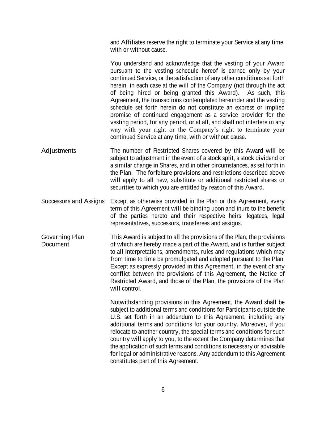 6 and Affiliates reserve the right to terminate your Service at any time, with or without cause. You understand and acknowledge that the vesting of your Award pursuant to the vesting schedule hereof is earned only by your continued Service, or the satisfaction of any other conditions set forth herein, in each case at the will of the Company (not through the act of being hired or being granted this Award). As such, this Agreement, the transactions contemplated hereunder and the vesting schedule set forth herein do not constitute an express or implied promise of continued engagement as a service provider for the vesting period, for any period, or at all, and shall not interfere in any way with your right or the Company’s right to terminate your continued Service at any time, with or without cause. Adjustments The number of Restricted Shares covered by this Award will be subject to adjustment in the event of a stock split, a stock dividend or a similar change in Shares, and in other circumstances, as set forth in the Plan. The forfeiture provisions and restrictions described above will apply to all new, substitute or additional restricted shares or securities to which you are entitled by reason of this Award. Successors and Assigns Except as otherwise provided in the Plan or this Agreement, every term of this Agreement will be binding upon and inure to the benefit of the parties hereto and their respective heirs, legatees, legal representatives, successors, transferees and assigns. Governing Plan Document This Award is subject to all the provisions of the Plan, the provisions of which are hereby made a part of the Award, and is further subject to all interpretations, amendments, rules and regulations which may from time to time be promulgated and adopted pursuant to the Plan. Except as expressly provided in this Agreement, in the event of any conflict between the provisions of this Agreement, the Notice of Restricted Award, and those of the Plan, the provisions of the Plan will control. Notwithstanding provisions in this Agreement, the Award shall be subject to additional terms and conditions for Participants outside the U.S. set forth in an addendum to this Agreement, including any additional terms and conditions for your country. Moreover, if you relocate to another country, the special terms and conditions for such country will apply to you, to the extent the Company determines that the application of such terms and conditions is necessary or advisable for legal or administrative reasons. Any addendum to this Agreement constitutes part of this Agreement.