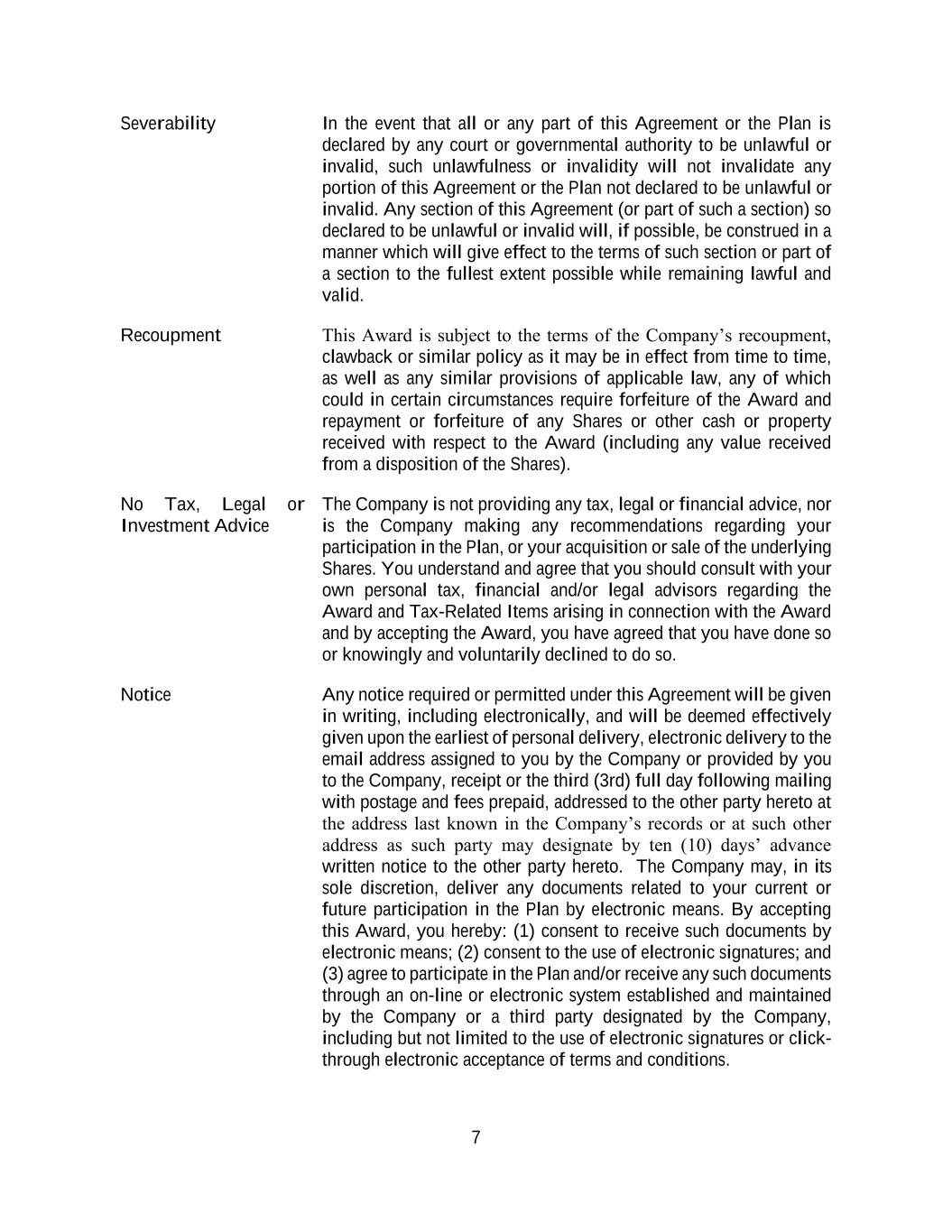 7 Severability In the event that all or any part of this Agreement or the Plan is declared by any court or governmental authority to be unlawful or invalid, such unlawfulness or invalidity will not invalidate any portion of this Agreement or the Plan not declared to be unlawful or invalid. Any section of this Agreement (or part of such a section) so declared to be unlawful or invalid will, if possible, be construed in a manner which will give effect to the terms of such section or part of a section to the fullest extent possible while remaining lawful and valid. Recoupment This Award is subject to the terms of the Company’s recoupment, clawback or similar policy as it may be in effect from time to time, as well as any similar provisions of applicable law, any of which could in certain circumstances require forfeiture of the Award and repayment or forfeiture of any Shares or other cash or property received with respect to the Award (including any value received from a disposition of the Shares). No Tax, Legal or Investment Advice The Company is not providing any tax, legal or financial advice, nor is the Company making any recommendations regarding your participation in the Plan, or your acquisition or sale of the underlying Shares. You understand and agree that you should consult with your own personal tax, financial and/or legal advisors regarding the Award and Tax-Related Items arising in connection with the Award and by accepting the Award, you have agreed that you have done so or knowingly and voluntarily declined to do so. Notice Any notice required or permitted under this Agreement will be given in writing, including electronically, and will be deemed effectively given upon the earliest of personal delivery, electronic delivery to the email address assigned to you by the Company or provided by you to the Company, receipt or the third (3rd) full day following mailing with postage and fees prepaid, addressed to the other party hereto at the address last known in the Company’s records or at such other address as such party may designate by ten (10) days’ advance written notice to the other party hereto. The Company may, in its sole discretion, deliver any documents related to your current or future participation in the Plan by electronic means. By accepting this Award, you hereby: (1) consent to receive such documents by electronic means; (2) consent to the use of electronic signatures; and (3) agree to participate in the Plan and/or receive any such documents through an on-line or electronic system established and maintained by the Company or a third party designated by the Company, including but not limited to the use of electronic signatures or click- through electronic acceptance of terms and conditions.