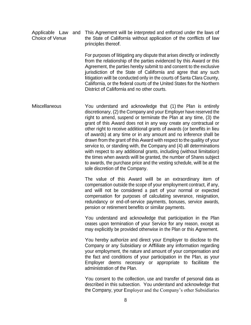 8 Applicable Law and Choice of Venue This Agreement will be interpreted and enforced under the laws of the State of California without application of the conflicts of law principles thereof. For purposes of litigating any dispute that arises directly or indirectly from the relationship of the parties evidenced by this Award or this Agreement, the parties hereby submit to and consent to the exclusive jurisdiction of the State of California and agree that any such litigation will be conducted only in the courts of Santa Clara County, California, or the federal courts of the United States for the Northern District of California and no other courts. Miscellaneous You understand and acknowledge that (1) the Plan is entirely discretionary, (2) the Company and your Employer have reserved the right to amend, suspend or terminate the Plan at any time, (3) the grant of this Award does not in any way create any contractual or other right to receive additional grants of awards (or benefits in lieu of awards) at any time or in any amount and no inference shall be drawn from the grant of this Award with respect to the quality of your service to, or standing with, the Company and (4) all determinations with respect to any additional grants, including (without limitation) the times when awards will be granted, the number of Shares subject to awards, the purchase price and the vesting schedule, will be at the sole discretion of the Company. The value of this Award will be an extraordinary item of compensation outside the scope of your employment contract, if any, and will not be considered a part of your normal or expected compensation for purposes of calculating severance, resignation, redundancy or end-of-service payments, bonuses, service awards, pension or retirement benefits or similar payments. You understand and acknowledge that participation in the Plan ceases upon termination of your Service for any reason, except as may explicitly be provided otherwise in the Plan or this Agreement. You hereby authorize and direct your Employer to disclose to the Company or any Subsidiary or Affiliate any information regarding your employment, the nature and amount of your compensation and the fact and conditions of your participation in the Plan, as your Employer deems necessary or appropriate to facilitate the administration of the Plan. You consent to the collection, use and transfer of personal data as described in this subsection. You understand and acknowledge that the Company, your Employer and the Company’s other Subsidiaries