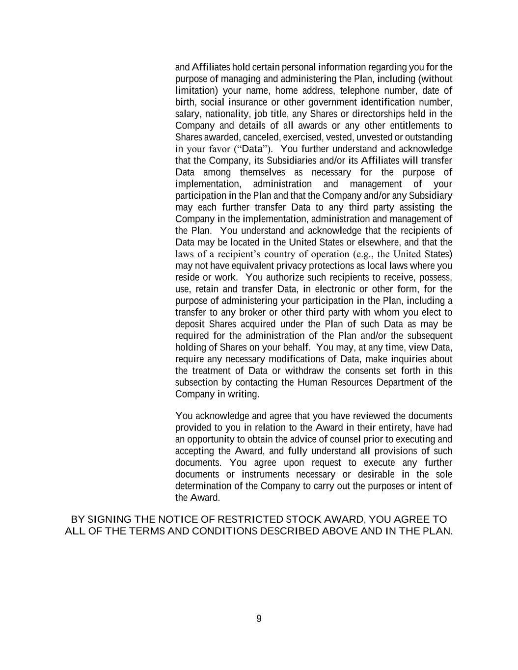 9 and Affiliates hold certain personal information regarding you for the purpose of managing and administering the Plan, including (without limitation) your name, home address, telephone number, date of birth, social insurance or other government identification number, salary, nationality, job title, any Shares or directorships held in the Company and details of all awards or any other entitlements to Shares awarded, canceled, exercised, vested, unvested or outstanding in your favor (“Data”). You further understand and acknowledge that the Company, its Subsidiaries and/or its Affiliates will transfer Data among themselves as necessary for the purpose of implementation, administration and management of your participation in the Plan and that the Company and/or any Subsidiary may each further transfer Data to any third party assisting the Company in the implementation, administration and management of the Plan. You understand and acknowledge that the recipients of Data may be located in the United States or elsewhere, and that the laws of a recipient’s country of operation (e.g., the United States) may not have equivalent privacy protections as local laws where you reside or work. You authorize such recipients to receive, possess, use, retain and transfer Data, in electronic or other form, for the purpose of administering your participation in the Plan, including a transfer to any broker or other third party with whom you elect to deposit Shares acquired under the Plan of such Data as may be required for the administration of the Plan and/or the subsequent holding of Shares on your behalf. You may, at any time, view Data, require any necessary modifications of Data, make inquiries about the treatment of Data or withdraw the consents set forth in this subsection by contacting the Human Resources Department of the Company in writing. You acknowledge and agree that you have reviewed the documents provided to you in relation to the Award in their entirety, have had an opportunity to obtain the advice of counsel prior to executing and accepting the Award, and fully understand all provisions of such documents. You agree upon request to execute any further documents or instruments necessary or desirable in the sole determination of the Company to carry out the purposes or intent of the Award. BY SIGNING THE NOTICE OF RESTRICTED STOCK AWARD, YOU AGREE TO ALL OF THE TERMS AND CONDITIONS DESCRIBED ABOVE AND IN THE PLAN.