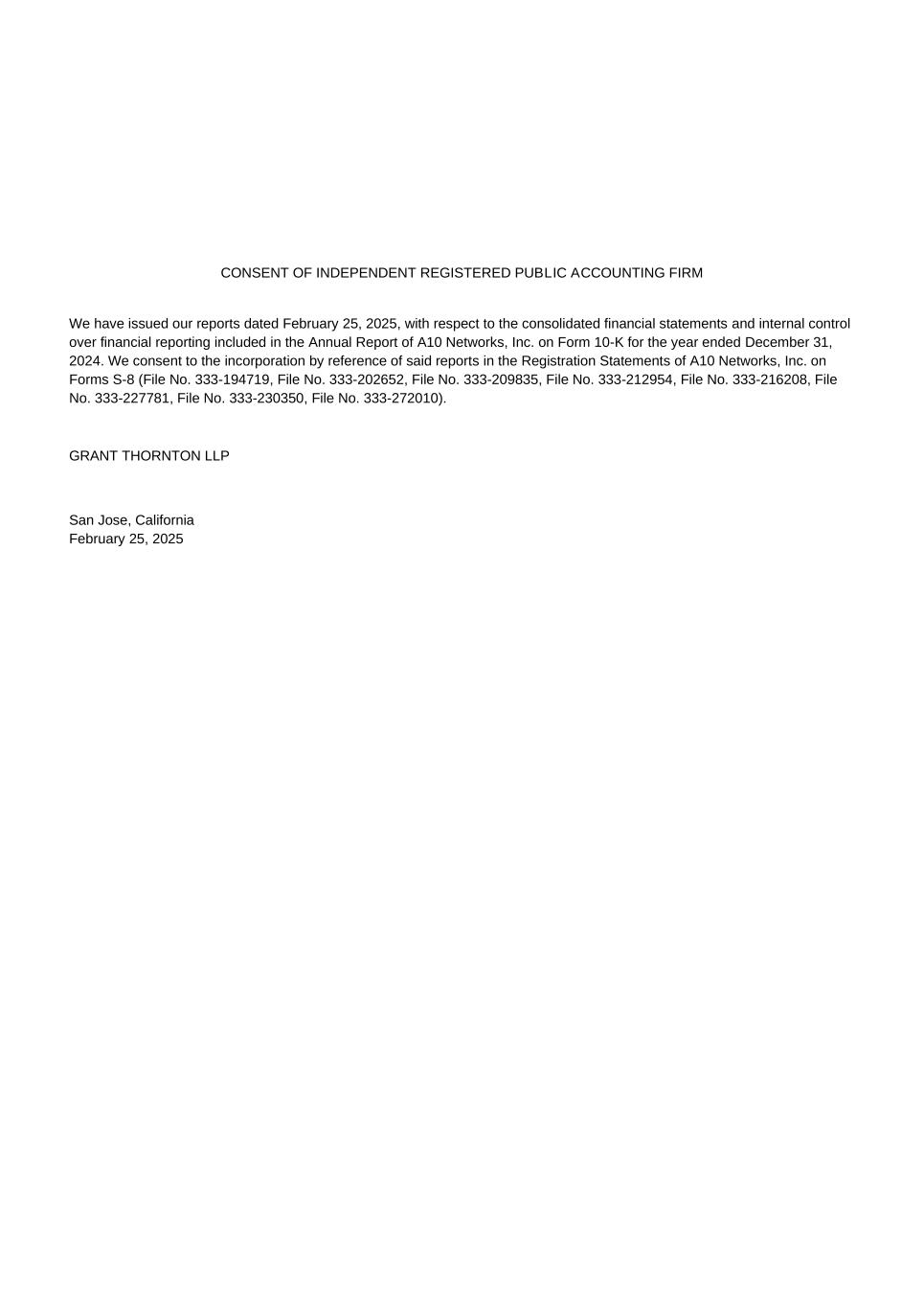 CONSENT OF INDEPENDENT REGISTERED PUBLIC ACCOUNTING FIRM We have issued our reports dated February 25, 2025, with respect to the consolidated financial statements and internal control over financial reporting included in the Annual Report of A10 Networks, Inc. on Form 10-K for the year ended December 31, 2024. We consent to the incorporation by reference of said reports in the Registration Statements of A10 Networks, Inc. on Forms S-8 (File No. 333-194719, File No. 333-202652, File No. 333-209835, File No. 333-212954, File No. 333-216208, File No. 333-227781, File No. 333-230350, File No. 333-272010). GRANT THORNTON LLP San Jose, California February 25, 2025