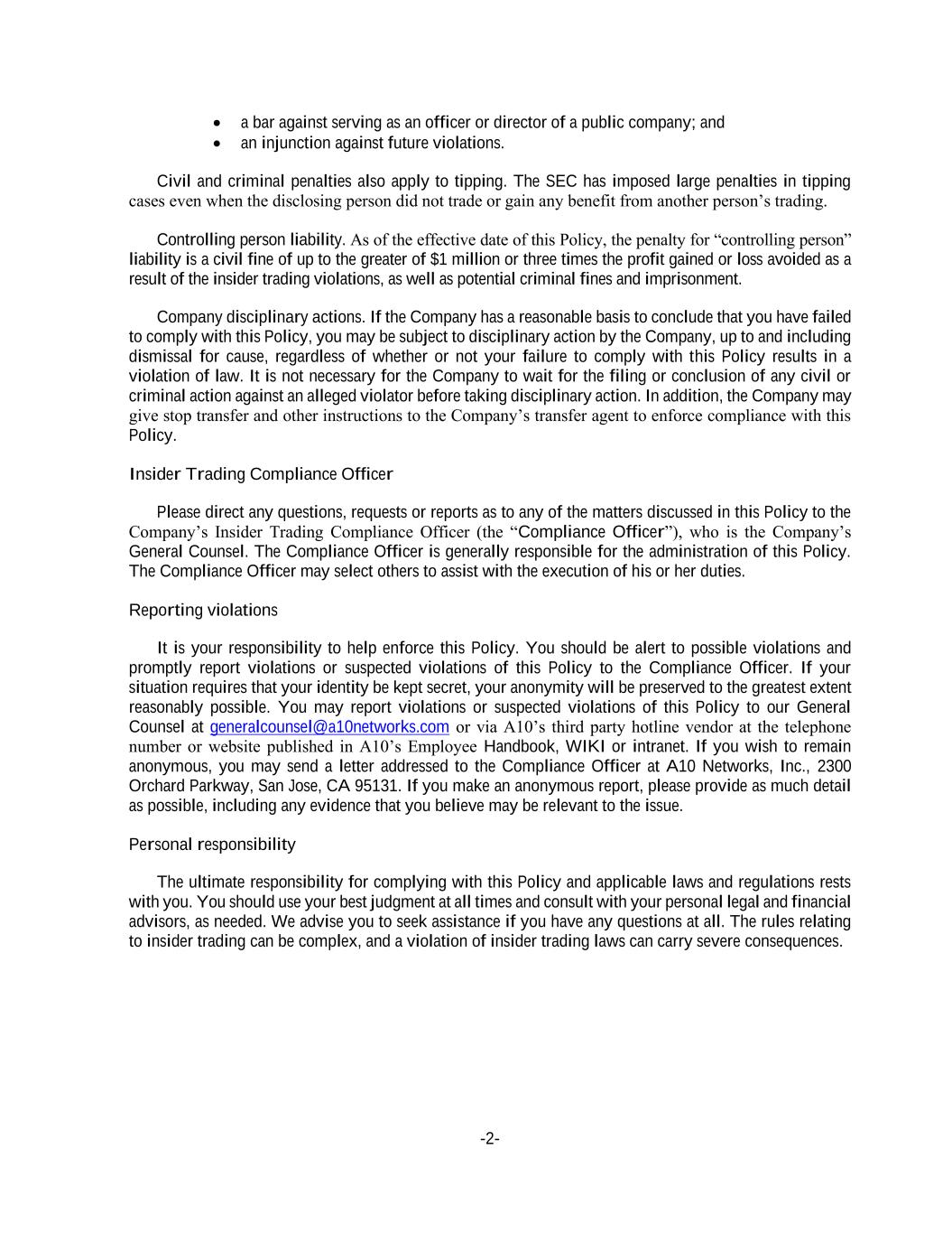 -2- • a bar against serving as an officer or director of a public company; and • an injunction against future violations. Civil and criminal penalties also apply to tipping. The SEC has imposed large penalties in tipping cases even when the disclosing person did not trade or gain any benefit from another person’s trading. Controlling person liability. As of the effective date of this Policy, the penalty for “controlling person” liability is a civil fine of up to the greater of $1 million or three times the profit gained or loss avoided as a result of the insider trading violations, as well as potential criminal fines and imprisonment. Company disciplinary actions. If the Company has a reasonable basis to conclude that you have failed to comply with this Policy, you may be subject to disciplinary action by the Company, up to and including dismissal for cause, regardless of whether or not your failure to comply with this Policy results in a violation of law. It is not necessary for the Company to wait for the filing or conclusion of any civil or criminal action against an alleged violator before taking disciplinary action. In addition, the Company may give stop transfer and other instructions to the Company’s transfer agent to enforce compliance with this Policy. Insider Trading Compliance Officer Please direct any questions, requests or reports as to any of the matters discussed in this Policy to the Company’s Insider Trading Compliance Officer (the “Compliance Officer”), who is the Company’s General Counsel. The Compliance Officer is generally responsible for the administration of this Policy. The Compliance Officer may select others to assist with the execution of his or her duties. Reporting violations It is your responsibility to help enforce this Policy. You should be alert to possible violations and promptly report violations or suspected violations of this Policy to the Compliance Officer. If your situation requires that your identity be kept secret, your anonymity will be preserved to the greatest extent reasonably possible. You may report violations or suspected violations of this Policy to our General Counsel at generalcounsel@a10networks.com or via A10’s third party hotline vendor at the telephone number or website published in A10’s Employee Handbook, WIKI or intranet. If you wish to remain anonymous, you may send a letter addressed to the Compliance Officer at A10 Networks, Inc., 2300 Orchard Parkway, San Jose, CA 95131. If you make an anonymous report, please provide as much detail as possible, including any evidence that you believe may be relevant to the issue. Personal responsibility The ultimate responsibility for complying with this Policy and applicable laws and regulations rests with you. You should use your best judgment at all times and consult with your personal legal and financial advisors, as needed. We advise you to seek assistance if you have any questions at all. The rules relating to insider trading can be complex, and a violation of insider trading laws can carry severe consequences.