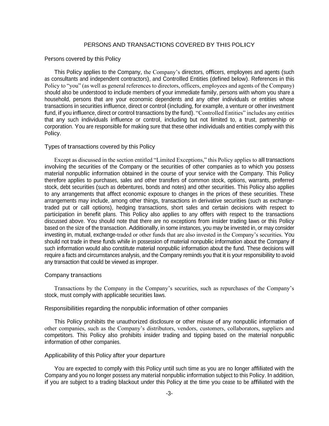 -3- PERSONS AND TRANSACTIONS COVERED BY THIS POLICY Persons covered by this Policy This Policy applies to the Company, the Company’s directors, officers, employees and agents (such as consultants and independent contractors), and Controlled Entities (defined below). References in this Policy to “you” (as well as general references to directors, officers, employees and agents of the Company) should also be understood to include members of your immediate family, persons with whom you share a household, persons that are your economic dependents and any other individuals or entities whose transactions in securities influence, direct or control (including, for example, a venture or other investment fund, if you influence, direct or control transactions by the fund). “Controlled Entities” includes any entities that any such individuals influence or control, including but not limited to, a trust, partnership or corporation. You are responsible for making sure that these other individuals and entities comply with this Policy. Types of transactions covered by this Policy Except as discussed in the section entitled “Limited Exceptions,” this Policy applies to all transactions involving the securities of the Company or the securities of other companies as to which you possess material nonpublic information obtained in the course of your service with the Company. This Policy therefore applies to purchases, sales and other transfers of common stock, options, warrants, preferred stock, debt securities (such as debentures, bonds and notes) and other securities. This Policy also applies to any arrangements that affect economic exposure to changes in the prices of these securities. These arrangements may include, among other things, transactions in derivative securities (such as exchange- traded put or call options), hedging transactions, short sales and certain decisions with respect to participation in benefit plans. This Policy also applies to any offers with respect to the transactions discussed above. You should note that there are no exceptions from insider trading laws or this Policy based on the size of the transaction. Additionally, in some instances, you may be invested in, or may consider investing in, mutual, exchange-traded or other funds that are also invested in the Company’s securities. You should not trade in these funds while in possession of material nonpublic information about the Company if such information would also constitute material nonpublic information about the fund. These decisions will require a facts and circumstances analysis, and the Company reminds you that it is your responsibility to avoid any transaction that could be viewed as improper. Company transactions Transactions by the Company in the Company’s securities, such as repurchases of the Company’s stock, must comply with applicable securities laws. Responsibilities regarding the nonpublic information of other companies This Policy prohibits the unauthorized disclosure or other misuse of any nonpublic information of other companies, such as the Company’s distributors, vendors, customers, collaborators, suppliers and competitors. This Policy also prohibits insider trading and tipping based on the material nonpublic information of other companies. Applicability of this Policy after your departure You are expected to comply with this Policy until such time as you are no longer affiliated with the Company and you no longer possess any material nonpublic information subject to this Policy. In addition, if you are subject to a trading blackout under this Policy at the time you cease to be affiliated with the