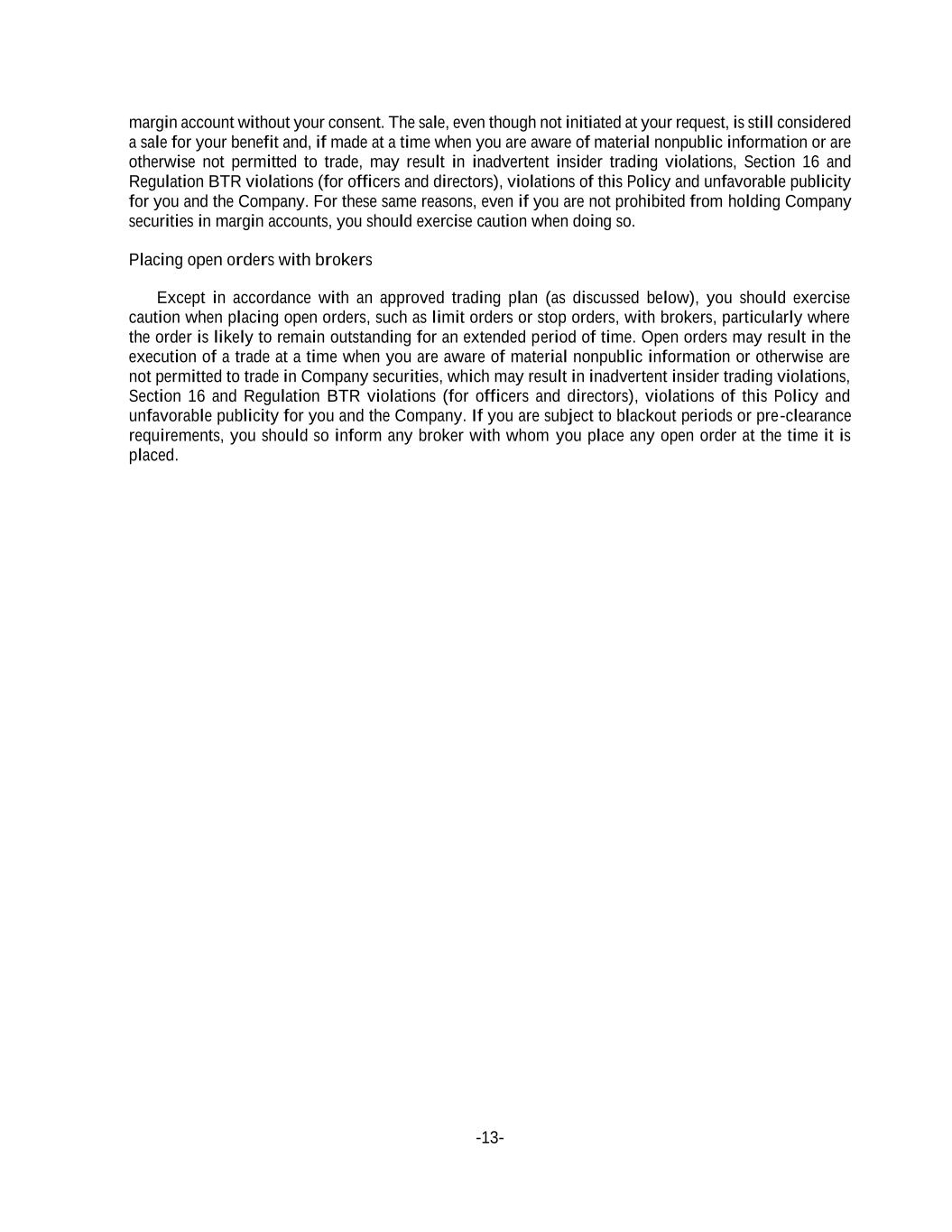 -13- margin account without your consent. The sale, even though not initiated at your request, is still considered a sale for your benefit and, if made at a time when you are aware of material nonpublic information or are otherwise not permitted to trade, may result in inadvertent insider trading violations, Section 16 and Regulation BTR violations (for officers and directors), violations of this Policy and unfavorable publicity for you and the Company. For these same reasons, even if you are not prohibited from holding Company securities in margin accounts, you should exercise caution when doing so. Placing open orders with brokers Except in accordance with an approved trading plan (as discussed below), you should exercise caution when placing open orders, such as limit orders or stop orders, with brokers, particularly where the order is likely to remain outstanding for an extended period of time. Open orders may result in the execution of a trade at a time when you are aware of material nonpublic information or otherwise are not permitted to trade in Company securities, which may result in inadvertent insider trading violations, Section 16 and Regulation BTR violations (for officers and directors), violations of this Policy and unfavorable publicity for you and the Company. If you are subject to blackout periods or pre-clearance requirements, you should so inform any broker with whom you place any open order at the time it is placed.