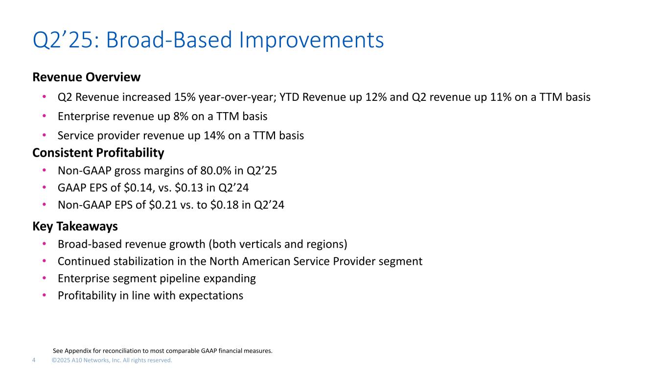 Q2’25: Broad-Based Improvements Revenue Overview • Q2 Revenue increased 15% year-over-year; YTD Revenue up 12% and Q2 revenue up 11% on a TTM basis • Enterprise revenue up 8% on a TTM basis • Service provider revenue up 14% on a TTM basis Consistent Profitability • Non-GAAP gross margins of 80.0% in Q2’25 • GAAP EPS of $0.14, vs. $0.13 in Q2’24 • Non-GAAP EPS of $0.21 vs. to $0.18 in Q2’24 Key Takeaways • Broad-based revenue growth (both verticals and regions) • Continued stabilization in the North American Service Provider segment • Enterprise segment pipeline expanding • Profitability in line with expectations See Appendix for reconciliation to most comparable GAAP financial measures.