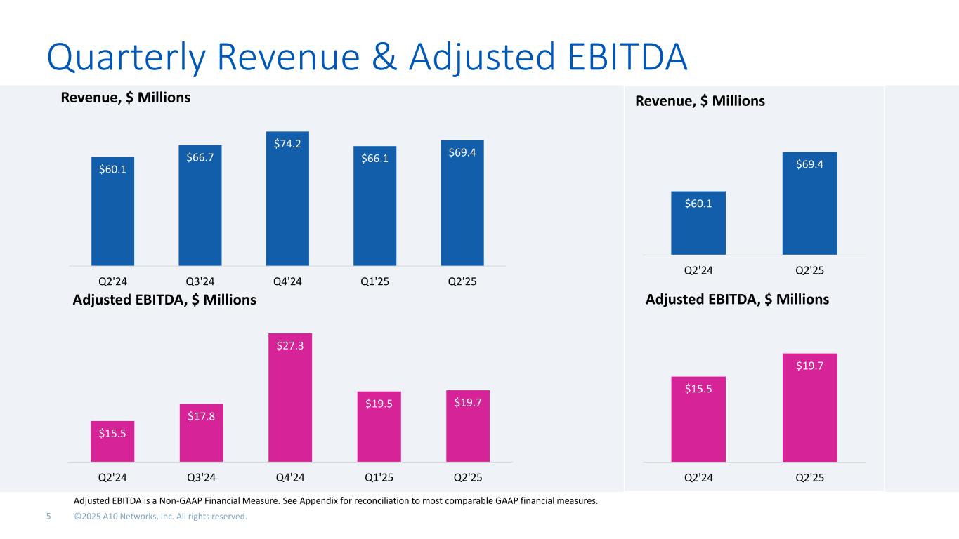 Financial Performance Trends Numbers may not sum due to rounding. Please refer to the supplemental financials posted in the “Investor Relations” section of the A10 Networks website at investors.a10networks.com Gross Margin %, Operating Margin %, Adjusted EBITDA and EPS are Non-GAAP Financial Measures. See Appendix for reconciliation to most comparable GAAP financial measures. $ Millions (except EPS) Q1’22 Q2’22 Q3’22 Q4’22 FY 2022 Q1’23 Q2’23 Q3’23 Q4’23 FY 2023 Q1’24 Q2’24 Q3’24 Q4’24 FY 2024 Q1’25 Q2’25 Revenue $62.7 $68.0 $72.1 $77.6 $280.3 $57.7 $65.8 $57.8 $70.4 $251.7 $60.7 $60.1 $66.7 $74.2 $261.7 $66.1 $69.4 Non-GAAP Gross Margin % 80.2% 80.6% 80.2% 80.3% 80.3% 83.1% 80.2% 81.8% 81.8% 81.7% 81.9% 80.9% 81.3% 80.7% 81.2% 80.9% 80.0% Non-GAAP Operating Margin % 18.6% 23.7% 27.0% 25.5% 23.9% 23.1% 23.1% 20.6% 30.4% 24.6% 18.5% 21.1% 22.6% 32.7% 24.2% 24.4% 23.6% Adjusted EBITDA (non-GAAP) $13.5 $18.0 $21.3 $22.3 $75.1 $15.5 $17.4 $14.4 $23.9 $71.2 $13.9 $15.5 $17.8 $27.3 $74.5 $19.5 $19.7 Non-GAAP EPS $0.13 $0.17 $0.20 $0.24 $0.74 $0.13 $0.19 $0.16 $0.25 $0.73 $0.17 $0.18 $0.21 $0.31 $0.86 $0.20 $0.21 Ending Cash & Marketable Securities $164.7 $166.8 $127.8 $151.0 $151.0 $144.5 $153.9 $169.0 $159.3 $159.3 $182.1 $177.1 $182.1 $195.6 $195.6 $355.8 $367.4