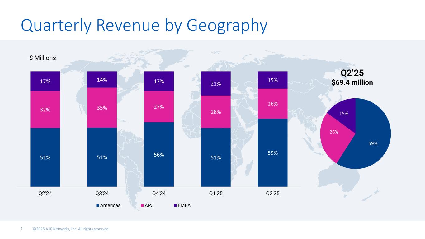 Quarterly Revenue by Geography 51% 51% 56% 51% 59% 32% 35% 27% 28% 26% 17% 14% 17% 21% 15% Q2'24 Q3'24 Q4'24 Q1'25 Q2'25 $ Millions Americas APJ EMEA 59% 26% 15% Q2’25 $69.4 million
