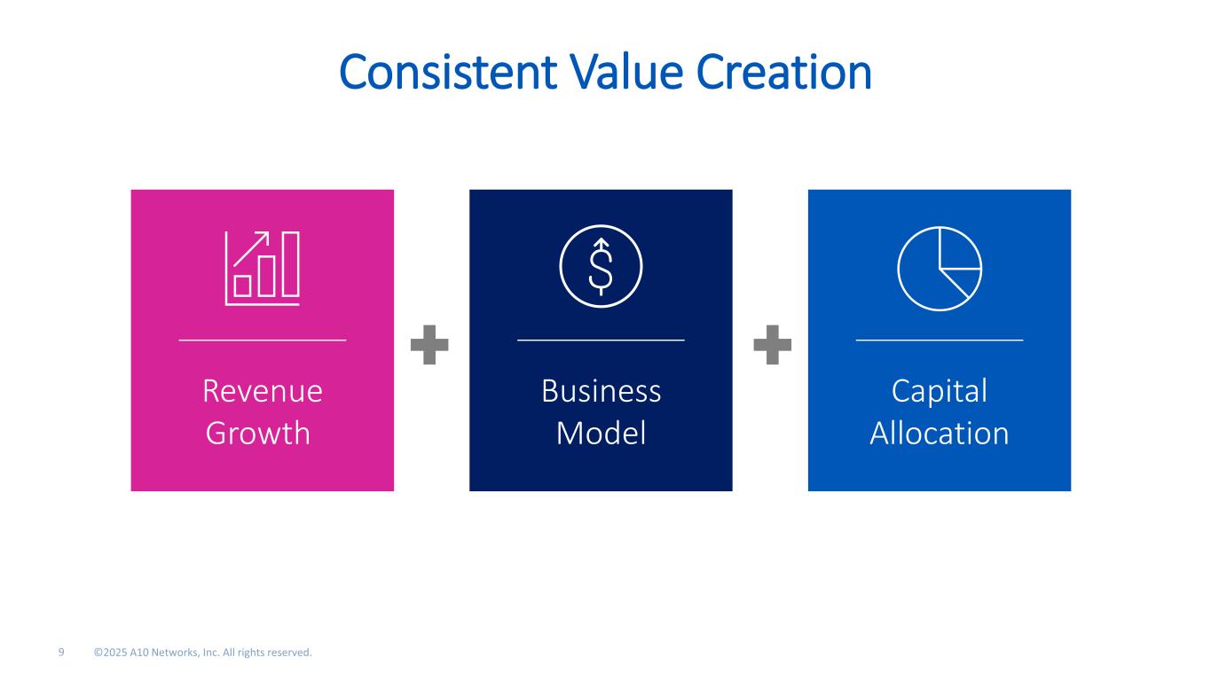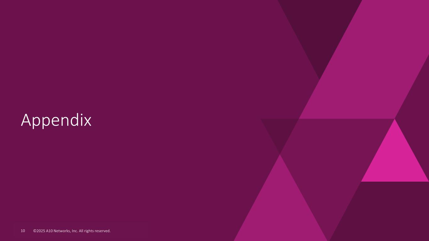Cautionary Statements & Disclosures This presentation and the accompanying oral presentation contain “forward-looking” statements that are based on our management’s beliefs and assumptions, including statements regarding our strategy, market, operations, profitability and positioning. Forward-looking statements are subject to known and unknown risks and uncertainties and are based on assumptions that may prove to be incorrect, which could cause actual results to differ materially from those expected or implied by the forward-looking statements. Factors that may cause actual results to differ include any unforeseen need for capital which may require us to divert funds we may have otherwise used for the dividend program or stock repurchase program, which may in turn negatively impact our ability to administer the quarterly dividends or the repurchase of our common stock; a significant decline in global macroeconomic or political conditions that have an adverse impact on our business and financial results; an expansion of adversarial global trade dynamics or other changes to international trade regulations; business interruptions related to our supply chain; our ability to manage our business and expenses if customers cancel or delay orders; execution risks related to closing key deals and improving our execution; the continued market adoption of our products; our ability to successfully anticipate market needs and opportunities; our timely development of new products and features; our ability to achieve or maintain profitability; any loss or delay of expected purchases by our largest end-customers; our ability to maintain or improve our competitive position; competitive and execution risks related to cloud-based computing trends; our ability to attract and retain new end-customers and our largest end-consumers; our ability to maintain and enhance our brand and reputation; changes demanded by our customers in the deployment and payment model for our products; continued growth in markets relating to network security; the success of any future acquisitions or investments in complementary companies, products, services or technologies; the ability of our sales team to execute well; our ability to shorten our close cycles; the ability of our channel partners to sell our products; variations in product mix or geographic locations of our sales; risks associated with our presence in international markets; weaknesses or deficiencies in our internal control over financial reporting; our ability to timely file periodic reports required to be filed under the Securities Exchange Act of 1934; and other risks that are described in “Risk Factors” in our periodic filings with the Securities and Exchange Commission, including our Form 10-K filed with the Securities and Exchange Commission on February 25, 2025. We do not intend to update or alter our forward-looking statements, whether as a result of new information, future events or otherwise, except as required by applicable law. This presentation and the accompanying oral presentation also include certain non-GAAP financial measures including non-GAAP net income, non-GAAP net income per basic and diluted share (or non-GAAP EPS), non- GAAP gross profit and gross margin, non-GAAP operating expenses, non-GAAP operating income and operating margin, Adjusted EBITDA and Adjusted EBITDA margin. Non-GAAP financial measures do not have any standardized meaning and are therefore unlikely to be comparable to similarly titles measures presented by other companies. A10 Networks considers these non-GAAP financial measures to be important because they provide useful measures of the operating performance of the company, exclusive of unusual events or factors that do not directly affect what we consider to be our core operating performance and are used by the company’s management for that purpose. Non-GAAP financial measures should not be considered in isolation from, or as a substitute for, financial information prepared in accordance with GAAP. We define non-GAAP net income as our GAAP net income excluding: (i) stock-based compensation and related payroll tax, (ii) acquisition-related expense, (iii) amortization of purchased intangible assets, (iv) one-time legal expense, (v) tax planning expense and (vi) income tax effect of non-GAAP items (i) to (v) listed above. We define non-GAAP net income per basic and diluted share as our non-GAAP net income divided by our basic and diluted weighted- average shares outstanding. We define non-GAAP gross profit as our GAAP gross profit excluding (i) stock-based compensation and related payroll tax and (ii) amortization of purchased intangible assets. We define non- GAAP gross margin as our non-GAAP gross profit divided by our GAAP revenue. We define non-GAAP operating expenses as our GAAP operating expenses excluding (i) stock-based compensation and related payroll tax, (ii) acquisition-related expense, (iii) amortization of purchased intangible assets, (iv) one-time legal expense and (v) tax planning expense. We define non-GAAP operating income as our GAAP income from operations excluding (i) stock-based compensation and related payroll tax, (ii) acquisition-related expense, (iii) amortization of purchased intangible assets, (iv) one-time legal expense and (v) tax planning expense. We define non- GAAP operating margin as our non-GAAP operating income divided by our GAAP revenue. We define Adjusted EBITDA as our GAAP net income excluding (i) interest and other (income) expense, net, (ii) depreciation and amortization expense, (iii) provision for income taxes, (iv) stock-based compensation and related payroll tax, (v) acquisition-related expense, (vi) one-time legal expense and (vii) tax planning expense. We define Adjusted EBITDA margin as our Adjusted EBITDA divided by our GAAP revenue. Non-GAAP financial measures are presented for supplemental informational purposes only for understanding the company's operating result