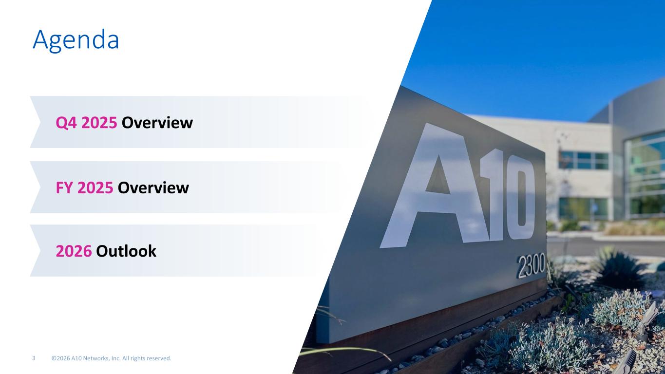 Cautionary Statements & Disclosures This presentation and the accompanying oral presentation contain “forward-looking” statements that are based on our management’s beliefs and assumptions, including statements regarding our strategy, market, operations, profitability and positioning. Forward-looking statements are subject to known and unknown risks and uncertainties and are based on assumptions that may prove to be incorrect, which could cause actual results to differ materially from those expected or implied by the forward-looking statements. Factors that may cause actual results to differ include any unforeseen need for capital which may require us to divert funds we may have otherwise used for the dividend program or stock repurchase program, which may in turn negatively impact our ability to administer the quarterly dividends or the repurchase of our common stock; a significant decline in global macroeconomic or political conditions that have an adverse impact on our business and financial results; an expansion of adversarial global trade dynamics or other changes to international trade regulations; business interruptions related to our supply chain; our ability to manage our business and expenses if customers cancel or delay orders; execution risks related to closing key deals and improving our execution; the continued market adoption of our products; our ability to successfully anticipate market needs and opportunities; our timely development of new products and features; our ability to achieve or maintain profitability; any loss or delay of expected purchases by our largest end-customers; our ability to maintain or improve our competitive position; competitive and execution risks related to cloud-based computing trends; our ability to attract and retain new end-customers and our largest end-consumers; our ability to maintain and enhance our brand and reputation; changes demanded by our customers in the deployment and payment model for our products; continued growth in markets relating to network security; the success of any future acquisitions or investments in complementary companies, products, services or technologies; the ability of our sales team to execute well; our ability to shorten our close cycles; the ability of our channel partners to sell our products; variations in product mix or geographic locations of our sales; risks associated with our presence in international markets; weaknesses or deficiencies in our internal control over financial reporting; our ability to timely file periodic reports required to be filed under the Securities Exchange Act of 1934; and other risks that are described in “Risk Factors” in our periodic filings with the Securities and Exchange Commission, including our Form 10-K filed with the Securities and Exchange Commission on February 25, 2025. We do not intend to update or alter our forward-looking statements, whether as a result of new information, future events or otherwise, except as required by applicable law. This presentation and the accompanying oral presentation also include certain non-GAAP financial measures including non-GAAP net income, non-GAAP net income per basic and diluted share (or non-GAAP EPS), non-GAAP gross profit and gross margin, non-GAAP operating expenses, non-GAAP operating income and operating margin, Adjusted EBITDA and Adjusted EBITDA margin. Non-GAAP financial measures do not have any standardized meaning and are therefore unlikely to be comparable to similarly titles measures presented by other companies. A10 Networks considers these non-GAAP financial measures to be important because they provide useful measures of the operating performance of the company, exclusive of unusual events or factors that do not directly affect what we consider to be our core operating performance and are used by the company’s management for that purpose. Non-GAAP financial measures should not be considered in isolation from, or as a substitute for, financial information prepared in accordance with GAAP. We define non-GAAP net income as our GAAP net income excluding: (i) stock-based compensation and related payroll tax, (ii) acquisition-related expense, (iii) amortization of purchased intangible assets, (iv) one- time legal expense, (v) tax planning expense and (vi) income tax effect of non-GAAP items (i) to (v) listed above. We define non-GAAP net income per basic and diluted share as our non-GAAP net income divided by our basic and diluted weighted-average shares outstanding. We define non-GAAP gross profit as our GAAP gross profit excluding (i) stock-based compensation and related payroll tax and (ii) amortization of purchased intangible assets. We define non-GAAP gross margin as our non-GAAP gross profit divided by our GAAP revenue. We define non-GAAP operating expenses as our GAAP operating expenses excluding (i) stock-based compensation and related payroll tax, (ii) acquisition-related expense, (iii) amortization of purchased intangible assets, (iv) one-time legal expense and (v) tax planning expense. We define non-GAAP operating income as our GAAP income from operations excluding (i) stock-based compensation and related payroll tax, (ii) acquisition-related expense, (iii) amortization of purchased intangible assets, (iv) one-time legal expense and (v) tax planning expense. We define non-GAAP operating margin as our non-GAAP operating income divided by our GAAP revenue. We define Adjusted EBITDA as our GAAP net income excluding (i) interest and other (income) expense, net, (ii) depreciation and amortization expense, (iii) provision for income taxes, (iv) stock-based compensation and related payroll tax, (v) acquisition-related expense, (vi) one-time legal expense and (vii) tax planning expense. We define Adjusted EBITDA margin as our Adjusted EBITDA divided by our GAAP revenue. Non-GAAP financial measures are presented for supplemental informational purposes only for understanding the company's operating results.