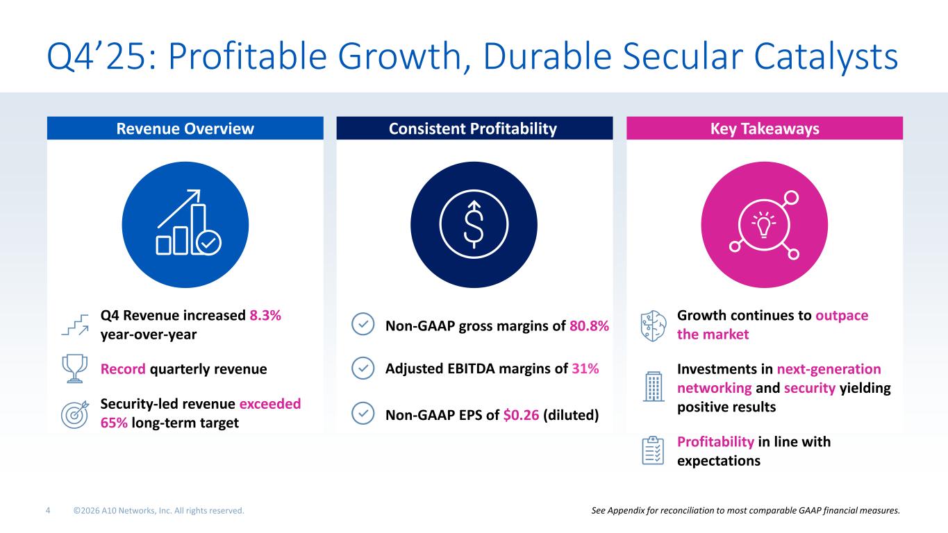 Q4’25: Profitable Growth, Durable Secular Catalysts Consistent Profitability Key TakeawaysRevenue Overview Q4 Revenue increased 8.3% year-over-year Record quarterly revenue Security-led revenue exceeded 65% long-term target Non-GAAP gross margins of 80.8% Adjusted EBITDA margins of 31% Non-GAAP EPS of $0.26 (diluted) Growth continues to outpace the market Investments in next-generation networking and security yielding positive results Profitability in line with expectations See Appendix for reconciliation to most comparable GAAP financial measures.