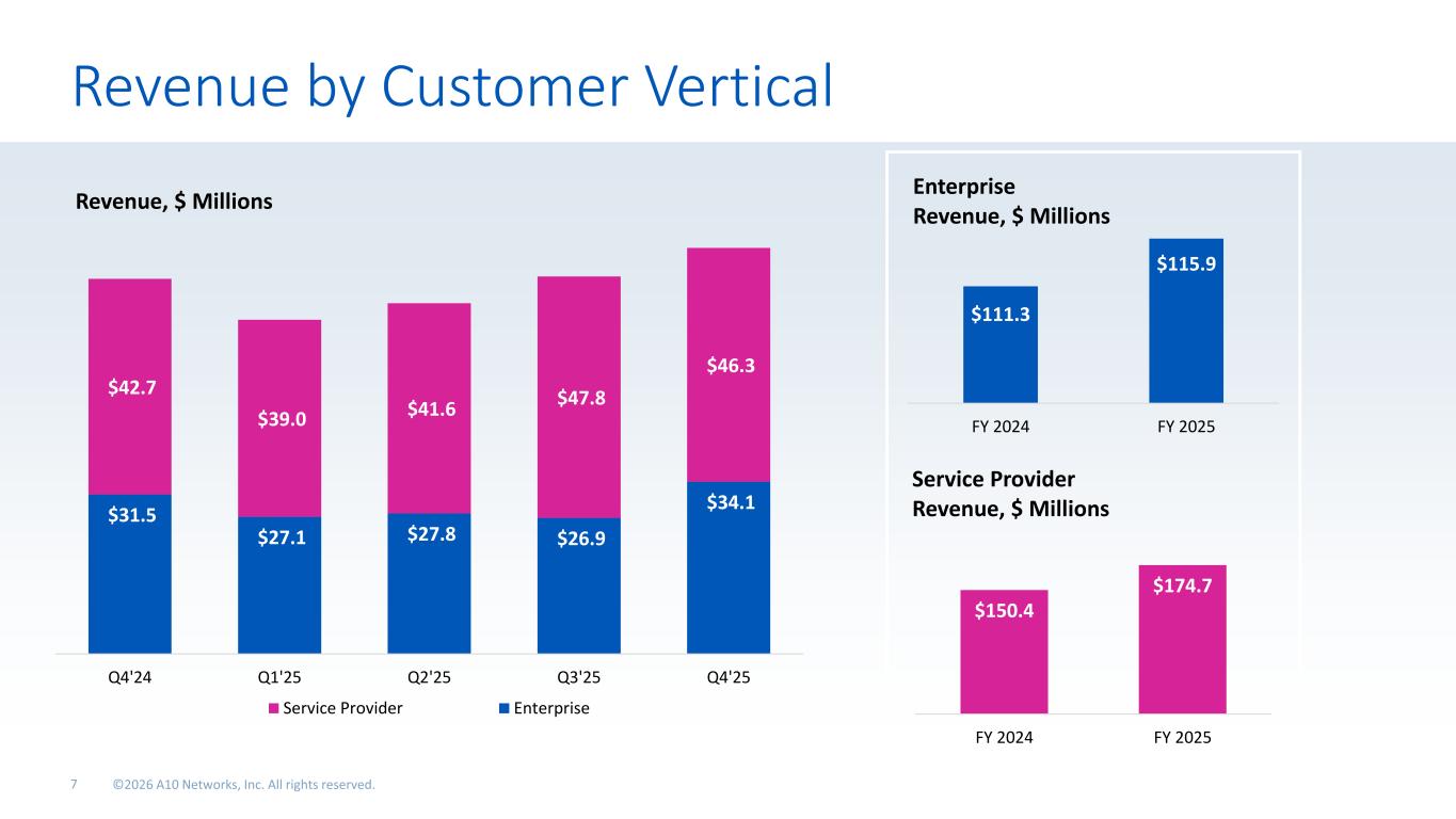 Revenue by Customer Vertical $150.4 $174.7 FY 2024 FY 2025 Service Provider Revenue, $ Millions$31.5 $27.1 $27.8 $26.9 $34.1 $42.7 $39.0 $41.6 $47.8 $46.3 Q4'24 Q1'25 Q2'25 Q3'25 Q4'25 Revenue, $ Millions Service Provider Enterprise $111.3 $115.9 FY 2024 FY 2025 Enterprise Revenue, $ Millions