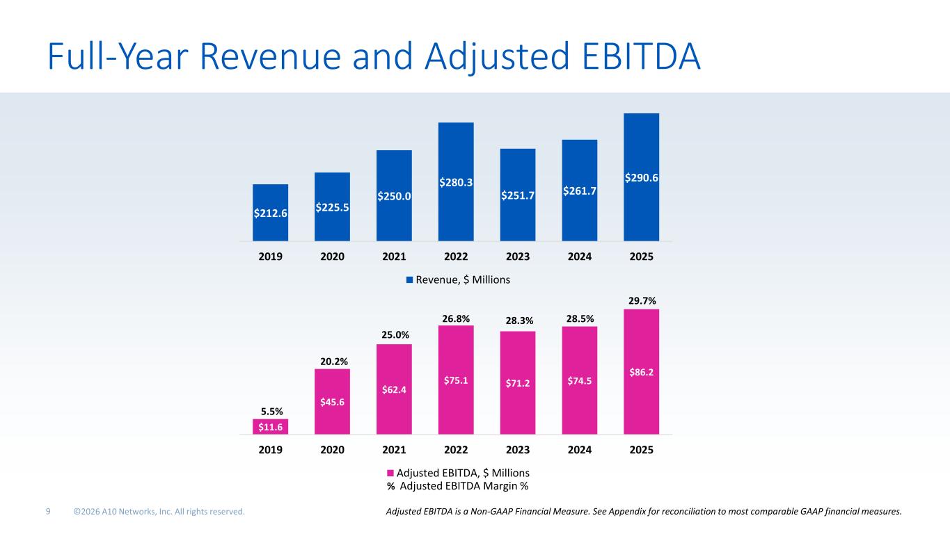 Financial Performance Trends Numbers may not sum due to rounding. Please refer to the supplemental financials posted in the “Investor Relations” section of the A10 Networks website at investors.A10networks.com Gross Margin %, Operating Margin %, Adjusted EBITDA and EPS are Non-GAAP Financial Measures. See Appendix for reconciliation to most comparable GAAP financial measures. $ Millions (except Margins and EPS) Q1’22 Q2’22 Q3’22 Q4’22 FY 2022 Q1’23 Q2’23 Q3’23 Q4’23 FY 2023 Q1’24 Q2’24 Q3’24 Q4’24 FY 2024 Q1’25 Q2’25 Q3'25 Q4’25 FY 2025 Revenue $62.7 $68.0 $72.1 $77.6 $280.3 $57.7 $65.8 $57.8 $70.4 $251.7 $60.7 $60.1 $66.7 $74.2 $261.7 $66.1 $69.4 $74.7 $80.4 $290.6 Non-GAAP Gross Margin % 80.2% 80.6% 80.2% 80.3% 80.3% 83.1% 80.2% 81.8% 81.8% 81.7% 81.9% 80.9% 81.3% 80.7% 81.2% 80.9% 80.0% 80.7% 80.8% 80.6% Non-GAAP Operating Margin % 18.6% 23.7% 27.0% 25.5% 23.9% 23.1% 23.1% 20.6% 30.4% 24.6% 18.5% 21.1% 22.6% 32.7% 24.2% 24.4% 23.6% 24.7% 26.6% 24.9% Adjusted EBITDA (non-GAAP) $13.5 $18.0 $21.3 $22.3 $75.1 $15.5 $17.4 $14.4 $23.9 $71.2 $13.9 $15.5 $17.8 $27.3 $74.5 $19.5 $19.7 $21.9 $24.9 $86.0 Non-GAAP EPS $0.13 $0.17 $0.20 $0.24 $0.74 $0.13 $0.19 $0.16 $0.25 $0.73 $0.17 $0.18 $0.21 $0.31 $0.86 $0.20 $0.21 $0.23 $0.26 $0.90 Ending Cash & Marketable Securities $164.7 $166.8 $127.8 $151.0 $151.0 $144.5 $153.9 $169.0 $159.3 $159.3 $182.1 $177.1 $182.1 $195.6 $195.6 $355.8 $367.4 $370.9 $377.9 $377.9