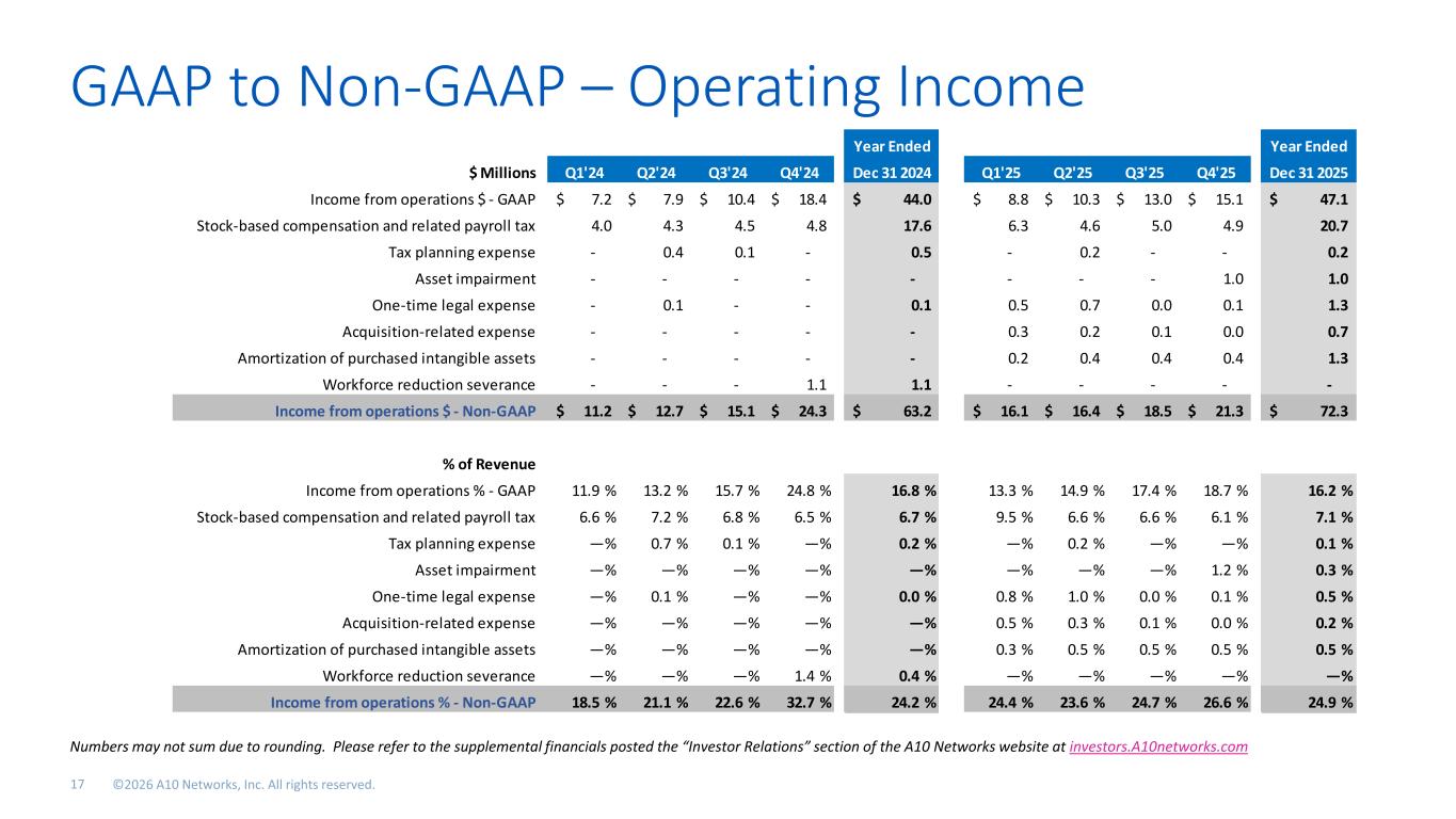 GAAP to Non-GAAP – Operating Income Numbers may not sum due to rounding. Please refer to the supplemental financials posted the “Investor Relations” section of the A10 Networks website at investors.A10networks.com. Q3’23 Year Ended Year Ended $ Millions Q1'24 Q2'24 Q3'24 Q4'24 Dec 31 2024 Q1'25 Q2'25 Q3'25 Q4'25 Dec 31 2025 Income from operations $ - GAAP 7.2$ 7.9$ 10.4$ 18.4$ 44.0$ 8.8$ 10.3$ 13.0$ 15.1$ 47.1$ Stock-based compensation and related payroll tax 4.0 4.3 4.5 4.8 17.6 6.3 4.6 5.0 4.9 20.7 Tax planning expense - 0.4 0.1 - 0.5 - 0.2 - - 0.2 Asset impairment - - - - - - - - 1.0 1.0 One-time legal expense - 0.1 - - 0.1 0.5 0.7 0.0 0.1 1.3 Acquisition-related expense - - - - - 0.3 0.2 0.1 0.0 0.7 Amortization of purchased intangible assets - - - - - 0.2 0.4 0.4 0.4 1.3 Workforce reduction severance - - - 1.1 1.1 - - - - - Income from operations $ - Non-GAAP 11.2$ 12.7$ 15.1$ 24.3$ 63.2$ 16.1$ 16.4$ 18.5$ 21.3$ 72.3$ % of Revenue Income from operations % - GAAP 11.9 % 13.2 % 15.7 % 24.8 % 16.8 % 13.3 % 14.9 % 17.4 % 18.7 % 16.2 % Stock-based compensation and related payroll tax 6.6 % 7.2 % 6.8 % 6.5 % 6.7 % 9.5 % 6.6 % 6.6 % 6.1 % 7.1 % Tax planning expense —% 0.7 % 0.1 % —% 0.2 % —% 0.2 % —% —% 0.1 % Asset impairment —% —% —% —% —% —% —% —% 1.2 % 0.3 % One-time legal expense —% 0.1 % —% —% 0.0 % 0.8 % 1.0 % 0.0 % 0.1 % 0.5 % Acquisition-related expense —% —% —% —% —% 0.5 % 0.3 % 0.1 % 0.0 % 0.2 % Amortization of purchased intangible assets —% —% —% —% —% 0.3 % 0.5 % 0.5 % 0.5 % 0.5 % Workforce reduction severance —% —% —% 1.4 % 0.4 % —% —% —% —% —% Income from operations % - Non-GAAP 18.5 % 21.1 % 22.6 % 32.7 % 24.2 % 24.4 % 23.6 % 24.7 % 26.6 % 24.9 %