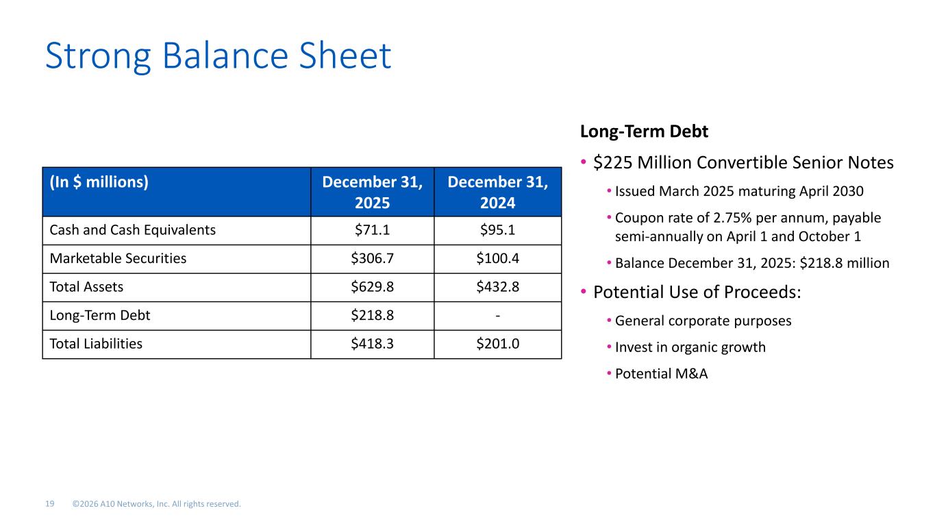 GAAP to Non-GAAP – Adjusted EBITDA Numbers may not sum due to rounding. Please refer to the supplemental financials posted the “Investor Relations” section of the A10 Networks website at investors.A10networks.com. Year Ended Year Ended $ Millions Q1'24 Q2'24 Q3'24 Q4'24 Dec 31 2024 Q1'25 Q2'25 Q3'25 Q4'25 Dec 31 2025 GAAP net income 9.7$ 9.5$ 12.6$ 18.3$ 50.1$ 9.5$ 10.5$ 12.2$ 9.9$ 42.1$ Exclude: Interest income and other income, net (4.0) (3.1) (3.9) (3.1) (14.1) (1.7) (1.6) (1.0) (1.0) (5.3) Exclude: Depreciation & amortization 2.7 2.8 2.7 3.0 11.3 3.6 3.7 3.8 4.0 15.1 Exclude: Provision for income taxes 1.5 1.5 1.8 3.2 8.0 0.9 1.4 1.8 6.2 10.3 EBITDA 9.9 10.7 13.2 21.4 55.3 12.4 14.0 16.8 19.0 62.2 Exclude: Stock-based compensation and related payroll tax 4.0 4.3 4.5 4.8 17.6 6.3 4.6 5.0 4.9 20.7 Exclude: Asset impairment expense - - - - - - - - 1.0 1.0 Exclude: Tax planning expense - 0.4 0.1 - 0.5 - 0.2 - - 0.2 Exclude: One-time legal expense - 0.1 - - 0.1 0.5 0.7 0.0 0.1 1.3 Exclude: Acquisiton-related expense - - - - - 0.3 0.2 0.1 0.0 0.7 Exclude: Workforce reduction severance - - - 1.1 1.1 - - - - - Adjusted EBITDA - Non-GAAP 13.9$ 15.5$ 17.8$ 27.3$ 74.5$ 19.5$ 19.7$ 21.9$ 24.9$ 86.0$