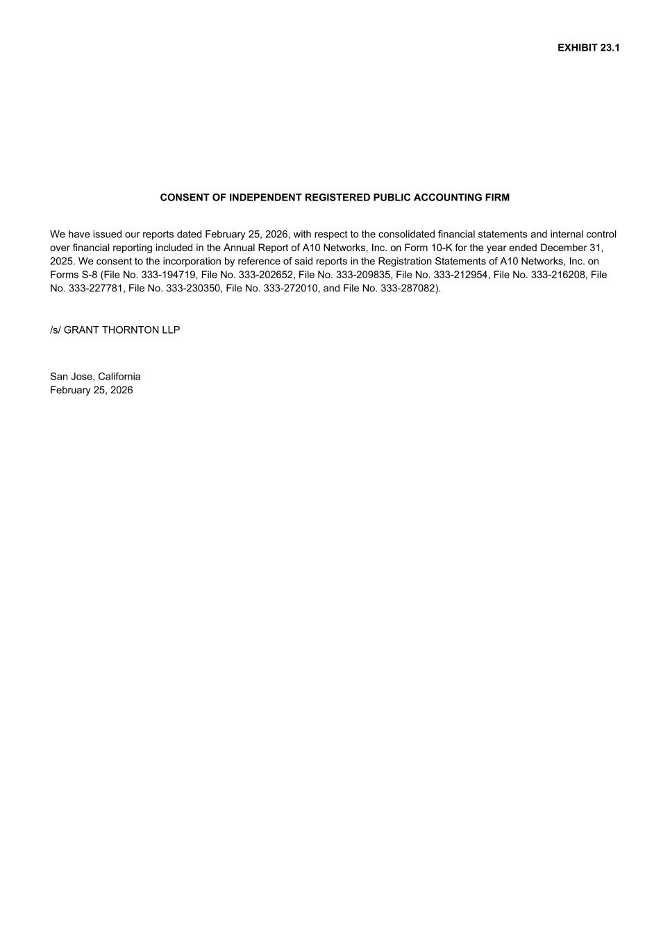 EXHIBIT 23.1 CONSENT OF INDEPENDENT REGISTERED PUBLIC ACCOUNTING FIRM We have issued our reports dated February 25, 2026, with respect to the consolidated financial statements and internal control over financial reporting included in the Annual Report of A10 Networks, Inc. on Form 10-K for the year ended December 31, 2025. We consent to the incorporation by reference of said reports in the Registration Statements of A10 Networks, Inc. on Forms S-8 (File No. 333-194719, File No. 333-202652, File No. 333-209835, File No. 333-212954, File No. 333-216208, File No. 333-227781, File No. 333-230350, File No. 333-272010, and File No. 333-287082). /s/ GRANT THORNTON LLP San Jose, California February 25, 2026