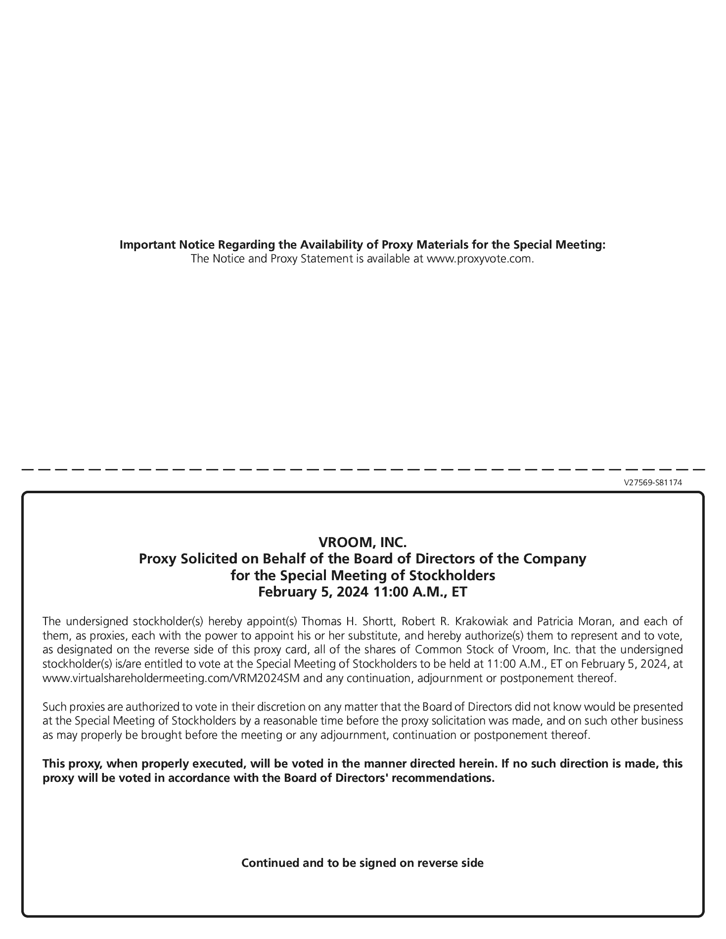 You are cordially invited to attend a Special Meeting of Stockholders (the “Special Meeting”) of Vroom, Inc. (the “Company,” “us,” “we” and “our”) on Monday, February 5, 2024, at 11:00 a.m., Eastern time. The Special Meeting will be a completely virtual meeting conducted via live webcast. You will be able to attend the Special Meeting online, vote your shares electronically and submit your questions during the Special Meeting by visiting www.virtualshareholdermeeting.com/VRM2024SM. Be sure to have your 16-digit control number included on your proxy card or the instructions that accompanied your proxy materials in order to join the Special Meeting.