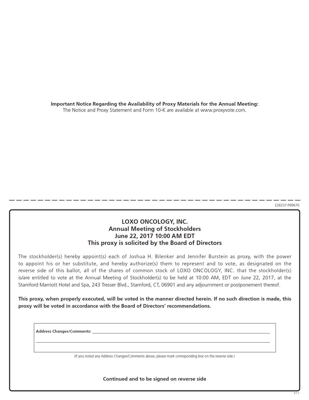 Important Notice Regarding the Availability of Proxy Materials for the Annual Meeting: The Notice and Proxy Statement and Form 10-K are available at www.proxyvote.com. E28237-P89676 LOXO ONCOLOGY, INC. Annual Meeting of Stockholders June 22, 2017 10:00 AM EDT This proxy is solicited by the Board of Directors The stockholder(s) hereby appoint(s) each of Joshua H. Bilenker and Jennifer Burstein as proxy, with the power to appoint his or her substitute, and hereby authorize(s) them to represent and to vote, as designated on the reverse side of this ballot, all of the shares of common stock of LOXO ONCOLOGY, INC. that the stockholder(s) is/are entitled to vote at the Annual Meeting of Stockholder(s) to be held at 10:00 AM, EDT on June 22, 2017, at the Stamford Marriott Hotel and Spa, 243 Tresser Blvd., Stamford, CT, 06901 and any adjournment or postponement thereof. This proxy, when properly executed, will be voted in the manner directed herein. If no such direction is made, this proxy will be voted in accordance with the Board of Directors' recommendations. (If you noted any Address Changes/Comments above, please mark corresponding box on the reverse side.) Continued and to be signed on reverse side V.1.1 Address Changes/Comments: