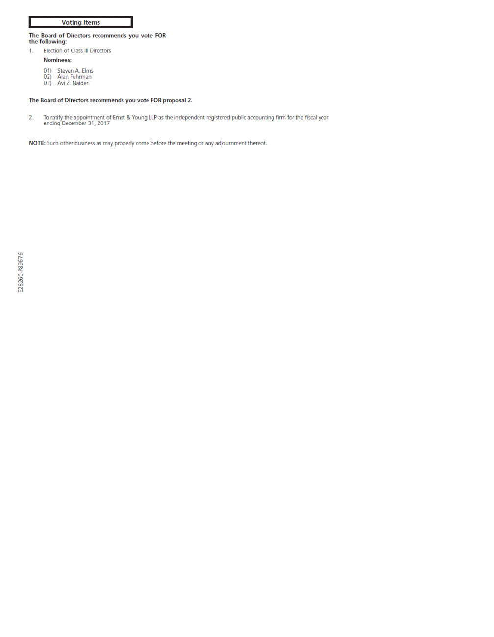 The Board of Directors recommends you vote FOR the following: 1. Election of Class III Directors Nominees: 01) 02) 03) Steven A. Elms Alan Fuhrman Avi Z. Naider The Board of Directors recommends you vote FOR proposal 2. 2. To ratify the appointment of Ernst & Young LLP as the independent registered public accounting firm for the fiscal year ending December 31, 2017 NOTE: Such other business as may properly come before the meeting or any adjournment thereof. E28260-P89676 Voting Items