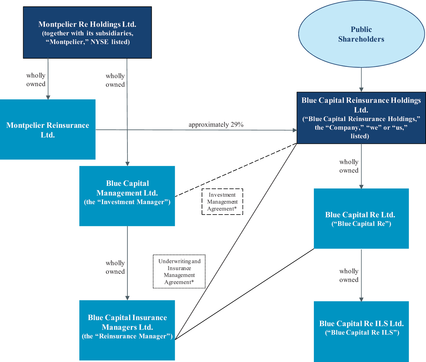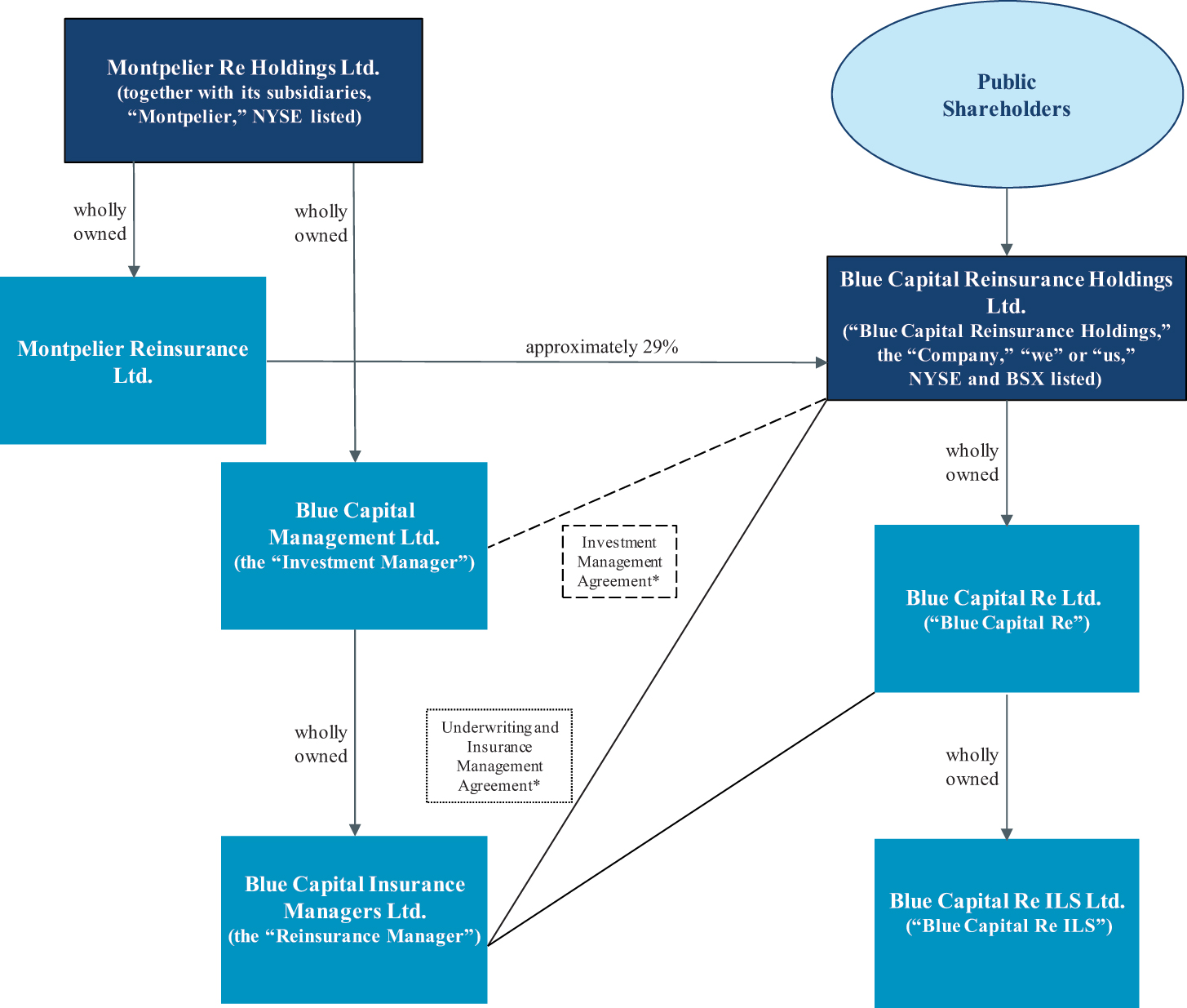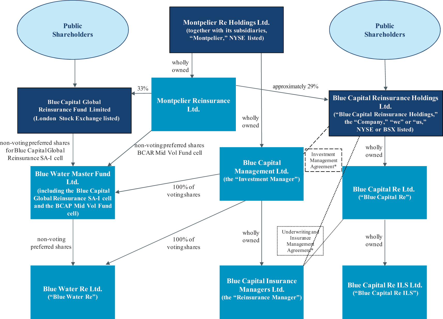 Unless the context suggests otherwise, references in this prospectus to “Blue Capital Reinsurance Holdings,” the “Company,” “we,” “us,” and “our” refer to Blue Capital Reinsurance Holdings Ltd. and its consolidated subsidiaries. References in this prospectus to “Blue Capital Re” refer to Blue Capital Re Ltd., our reinsurance operating company, and references in this prospectus to “Blue Capital Re ILS” refer to Blue Capital Re ILS Ltd., a wholly owned subsidiary of Blue Capital Re. References in this prospectus to “Montpelier” refer to Montpelier Re Holdings Ltd., a publicly traded insurance and reinsurance company that is making a concurrent investment through its wholly owned subsidiary, Montpelier Reinsurance Ltd., in our common shares upon the completion of this offering, and its consolidated subsidiaries. References in this prospectus to the “Investment Manager” refer to Blue Capital Management Ltd., a wholly owned subsidiary of Montpelier Re Holdings Ltd. References in this prospectus to the “Reinsurance Manager” refer to Blue Capital Insurance Managers Ltd., a wholly owned subsidiary of Montpelier Re Holdings Ltd. We refer to the Investment Manager and the Reinsurance Manager collectively as the “Managers.” For certain industry and other terms, investors are referred to the section entitled “Glossary of Industry and Other Terms” beginning on page 124.