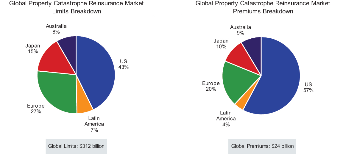 According to Guy Carpenter, the global property catastrophe reinsurance market was estimated to have approximately $312 billion in total aggregate limits (i.e., the maximum amount payable during the policy period to settle any claims made during that policy period) and to generate approximately $24 billion in total annualized premiums, in each case as of and for the 12 months ending March 31, 2013. The United States accounts for approximately 43% of global property catastrophe reinsurance exposures and approximately 57% of premiums.