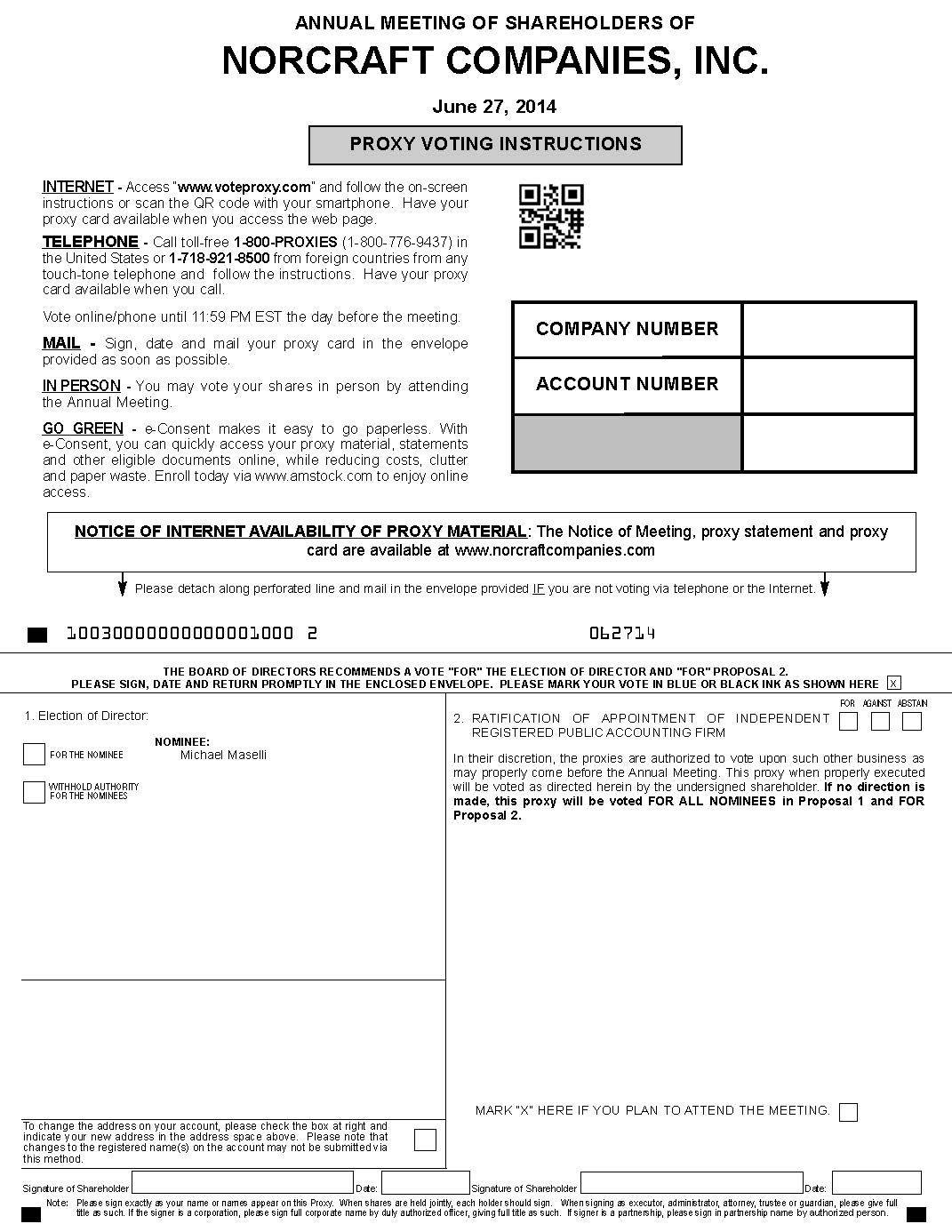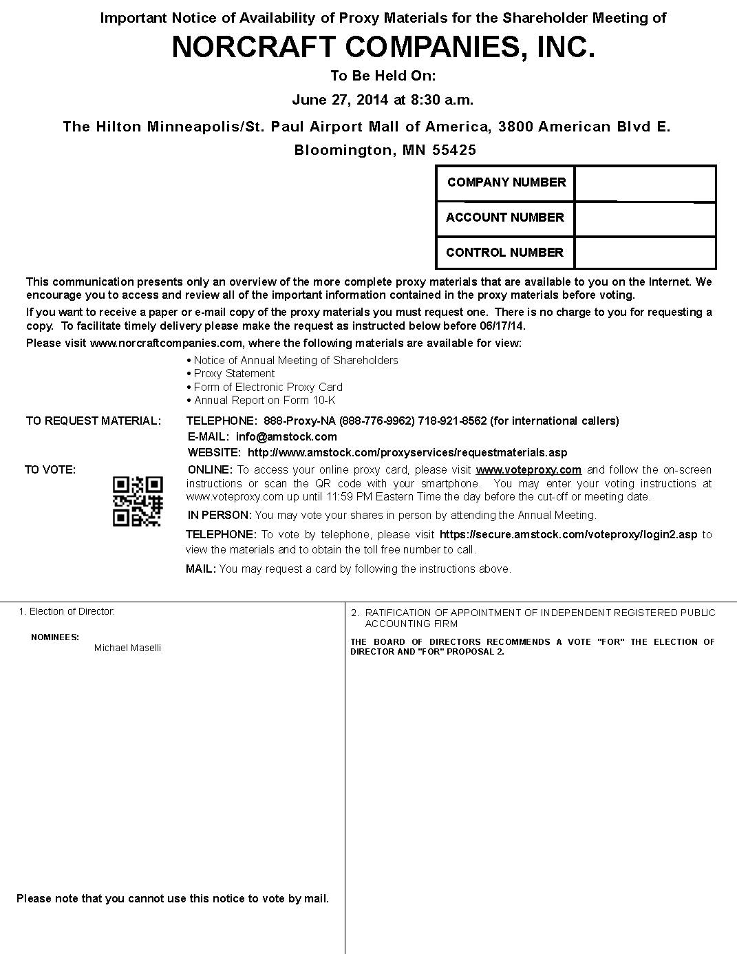 The 2014 Annual Meeting of Stockholders of Norcraft Companies, Inc., or the 2014 Annual Meeting, will be held at the Hilton Minneapolis/St. Paul Airport Mall of America, 3800 American Blvd East, Bloomington, MN 55425, on Friday, June 27, 2014 at 8:30 A.M. local time, to consider and act upon the following matters: