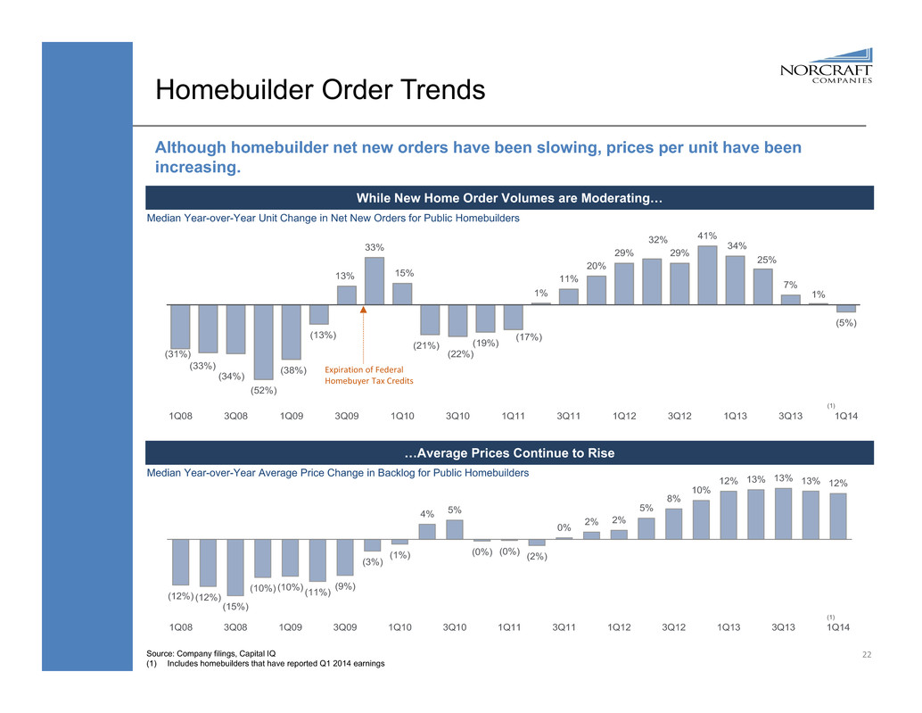 21 Industry Growth Outlook in Housing, R&R and Cabinetry Demand Capitalizing on the continued recovery in the new housing construction and repair and remodeling markets Norcraft Revenues by End Market Housing Starts Repair & Remodeling $148 $141 $122 $115 $119 $125 $129 $134 $144 $151 $159 ($ in Billions) Source: FMI Construction Report 2006 2013 Repair & Remodel 63% New Construction 37% Repair & Remodel 48% New Construction 52% Source: Management Existing Home Sales 1,812 1,342 900 554 586 612 783 925 1,060 1,370 1,570 (Units in Thousands) Source: US Census Bureau and S&P Average new home starts per year from 1968 to 2012: 1.5 million 6.5 5.0 4.1 4.3 4.2 4.3 4.7 5.1 5.6 6.0 5.8 (Units in Millions) Source: Global Insight