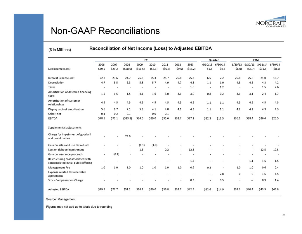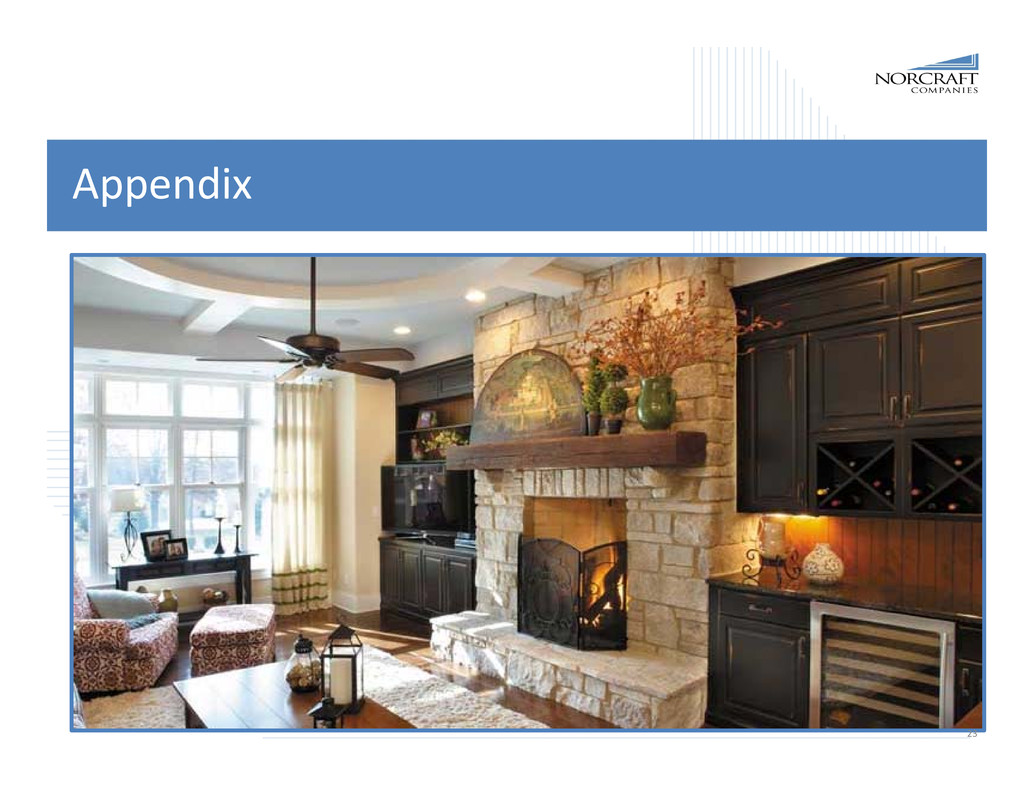 Company History • Norcraft raised $118 million in an Initial Public Offering in November 2013 • Norcraft has been able to outperform its peers in terms of market share and EBITDA margin largely driven by continual product line refinement and cost initiatives throughout the economic downturn • Omega Cabinets sold to Fortune Brands for $538 million. Mark subsequently left the company • Norcraft acquired the StarMark and Fieldstone brands with the acquisition of StarMark, Inc. to expand its product offering and customer base through the addition of a semi-custom framed cabinetry line • Marshall Millworks, Inc. founded in Minnesota • For the next 32 years, Marshall Millworks sold its products under the Mid Continent brand • Norcraft transitioned its Winnipeg plant from a component manufacturer providing door and frame parts for the Mid Continent division to the complete full access cabinet line product manufacturer for the Urban Effects division in Canada • Marshall Millworks subsequently changed its name to Norcraft Companies, Inc. • Mark Buller became president of Kitchen Craft • Herb Buller, the father of Mark Buller, co-founded Kitchen Craft, a Canadian cabinetry maker, beginning the long history of Buller family management in the cabinet industry • Kitchen Craft acquired by Omega Cabinets. Mark Buller eventually appointed CEO of Omega • Mark Buller, together with his family and senior management, SKM Equity Fund III and Trimaran Fund II, acquired Norcraft from the then-existing unitholders, issuing public debt as part of the acquisition Buller Family History Norcraft History • Norcraft acquired The UltraCraft Company, located in Liberty, North Carolina to expand its product offering and customer base through the addition of a semi-custom full access cabinetry line 1966 1971 1996 1998 2000 2002 2003 2007 1999 2007 ‐ Present 24