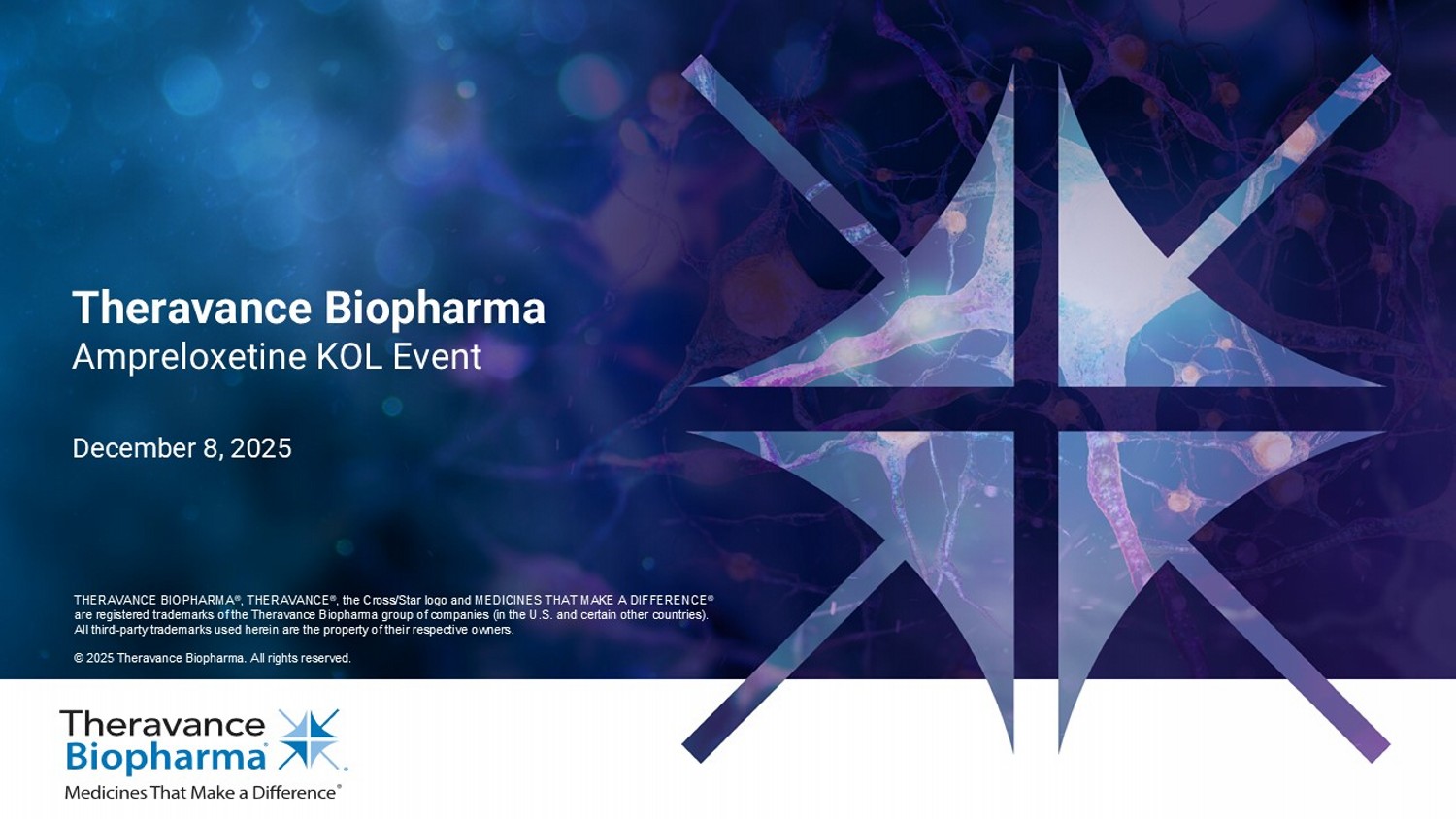 THERAVANCE BIOPHARMA ® , THERAVANCE ® , the Cross/Star logo and MEDICINES THAT MAKE A DIFFERENCE ® are registered trademarks of the Theravance Biopharma group of companies (in the U.S. and certain other countries). All third - party trademarks used herein are the property of their respective owners. © 2025 Theravance Biopharma. All rights reserved. Theravance Biopharma Ampreloxetine KOL Event December 8, 2025