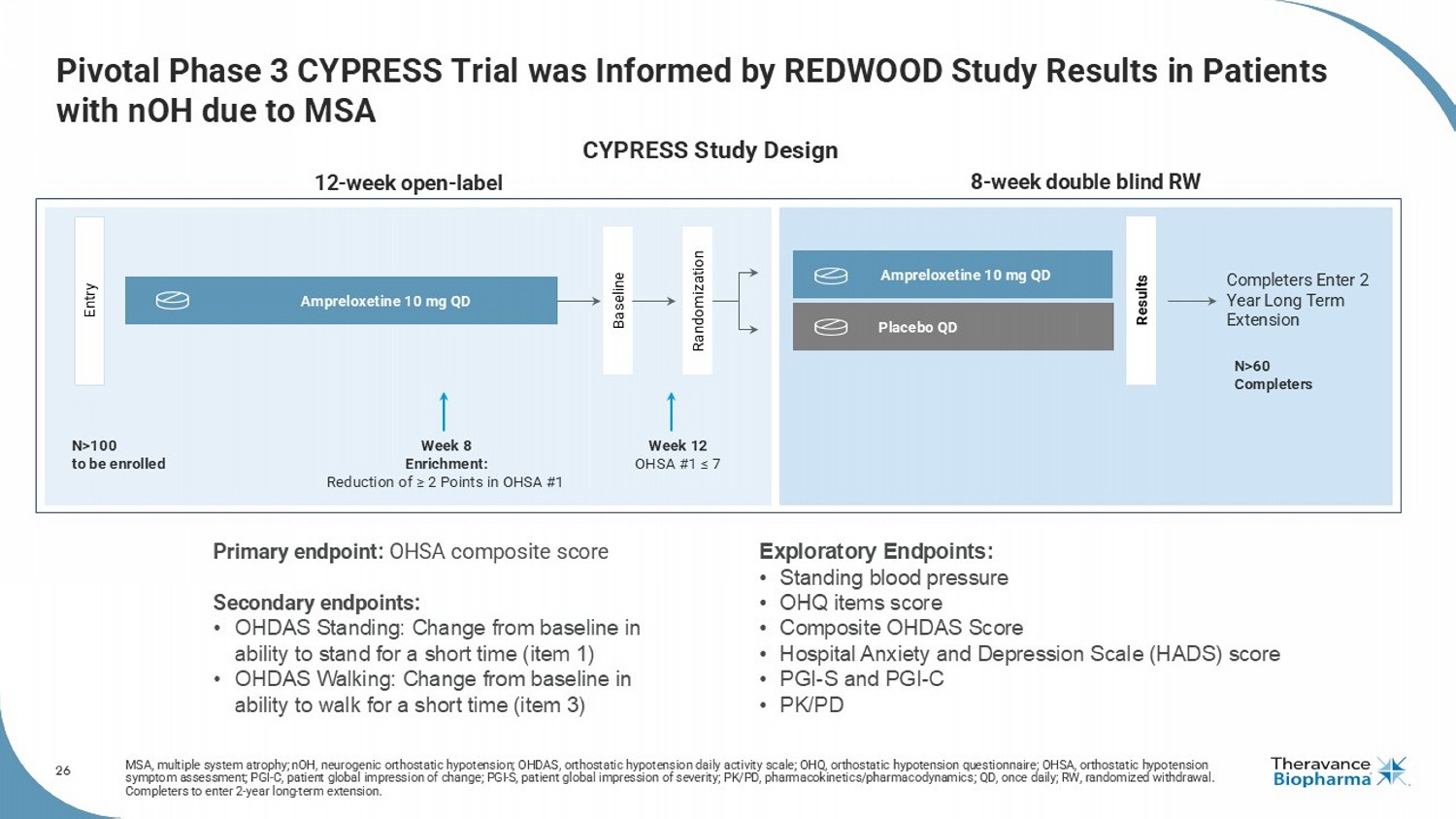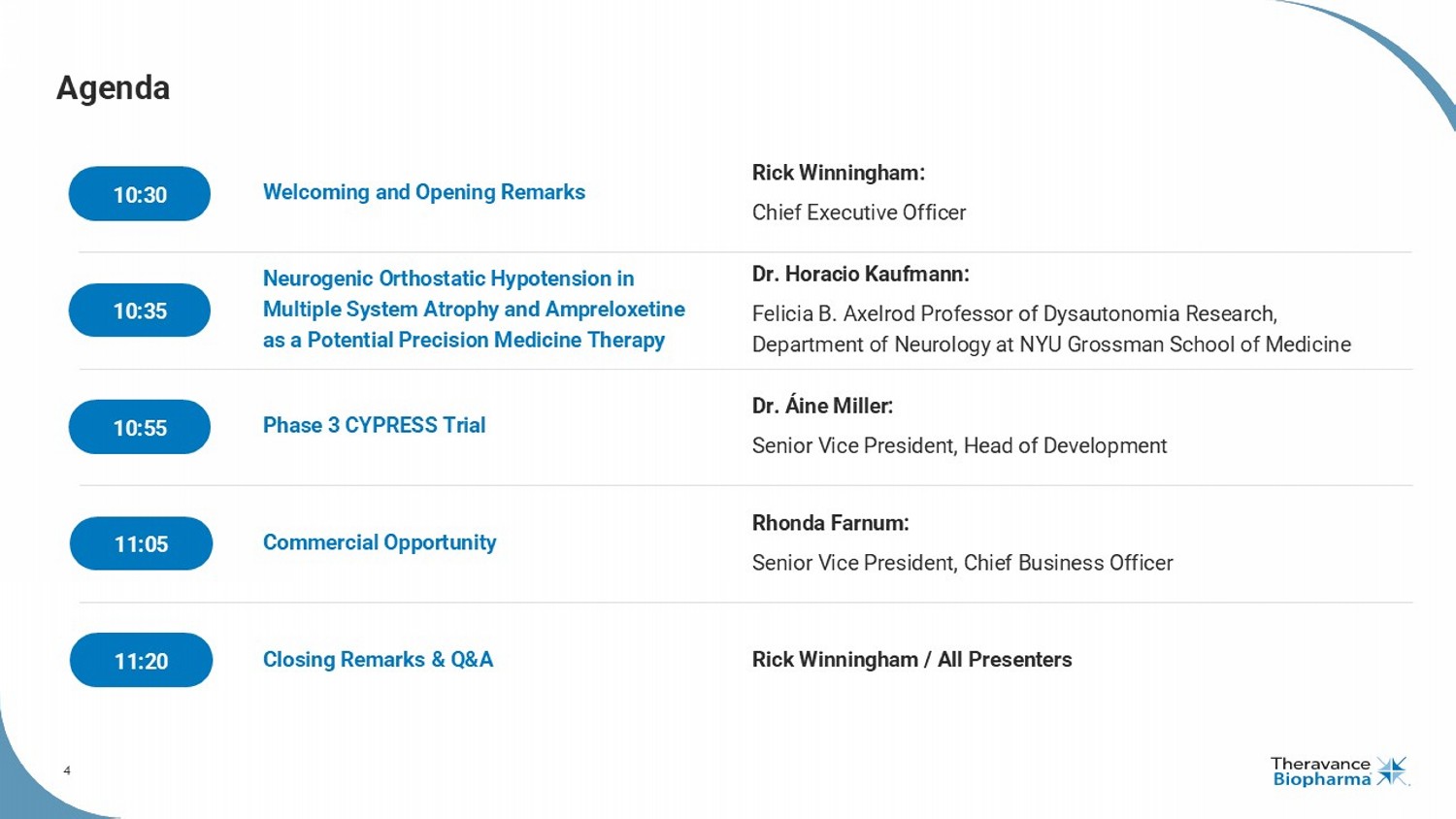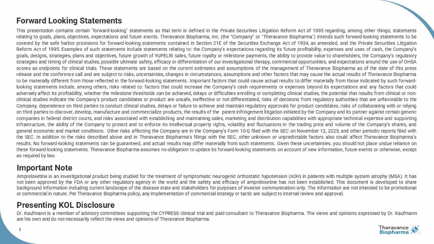 3 Forward Looking Statements This presentation contains certain "forward - looking" statements as that term is defined in the Private Securities Litigation Reform Act of 1995 regarding, among other things, statements relating to goals, plans, objectives, expectations and future events . Theravance Biopharma, Inc . (the “Company” or "Theravance Biopharma") intends such forward - looking statements to be covered by the safe harbor provisions for forward - looking statements contained in Section 21 E of the Securities Exchange Act of 1934 , as amended, and the Private Securities Litigation Reform Act of 1995 . Examples of such statements include statements relating to : the Company’s expectations regarding its future profitability, expenses and uses of cash, the Company’s goals, designs, strategies, plans and objectives, future growth of YUPELRI sales, future royalty or milestone payments, the ability to provide value to shareholders, the Company’s regulatory strategies and timing of clinical studies, possible ultimate safety, efficacy or differentiation of our investigational therapy, commercial opportunities, and expectations around the use of OHSA scores as endpoints for clinical trials . These statements are based on the current estimates and assumptions of the management of Theravance Biopharma as of the date of this press release and the conference call and are subject to risks, uncertainties, changes in circumstances, assumptions and other factors that may cause the actual results of Theravance Biopharma to be materially different from those reflected in the forward - looking statements . Important factors that could cause actual results to differ materially from those indicated by such forward - looking statements include, among others, risks related to : factors that could increase the Company’s cash requirements or expenses beyond its expectations and any factors that could adversely affect its profitability, whether the milestone thresholds can be achieved, delays or difficulties enrolling or completing clinical studies, the potential that results from clinical or non - clinical studies indicate the Company’s product candidates or product are unsafe, ineffective or not differentiated, risks of decisions from regulatory authorities that are unfavorable to the Company, dependence on third parties to conduct clinical studies, delays or failure to achieve and maintain regulatory approvals for product candidates, risks of collaborating with or relying on third parties to discover, develop, manufacture and commercialize products, the results of the patent infringement litigation initiated by the Company and its partner against certain generic companies in federal district courts, and risks associated with establishing and maintaining sales, marketing and distribution capabilities with appropriate technical expertise and supporting infrastructure, the ability of the Company to protect and to enforce its intellectual property rights, volatility and fluctuations in the trading price and volume of the Company’s shares, and general economic and market conditions . Other risks affecting the Company are in the Company’s Form 10 - Q filed with the SEC on November 12 , 2025 , and other periodic reports filed with the SEC . In addition to the risks described above and in Theravance Biopharma's filings with the SEC, other unknown or unpredictable factors also could affect Theravance Biopharma’s results . No forward - looking statements can be guaranteed, and actual results may differ materially from such statements . Given these uncertainties, you should not place undue reliance on these forward - looking statements . Theravance Biopharma assumes no obligation to update its forward - looking statements on account of new information, future events or otherwise, except as required by law . Important Note Ampreloxetine is an investigational product being studied for the treatment of symptomatic neurogenic orthostatic hypotension (nOH) in patients with multiple system atrophy (MSA) . It has not been approved by the FDA or any other regulatory agency in the world and the safety and efficacy of ampreloxetine has not been established . This document is developed to share background information including current landscape of the disease state and stakeholders for purposes of investor communication only . The information are not intended to be promotional or commercial in nature . Per Theravance Biopharma policy, any implementation of commercial strategy or tactic are subject to internal review and approval . Presenting KOL Disclosure Dr . Kaufmann is a member of advisory committees supporting the CYPRESS clinical trial and paid consultant to Theravance Biopharma . The views and opinions expressed by Dr . Kaufmann are his own and do not necessarily reflect the views and opinions of Theravance Biopharma .