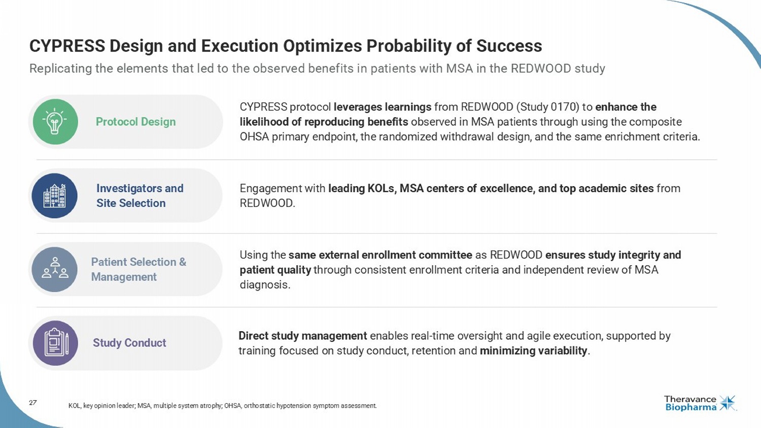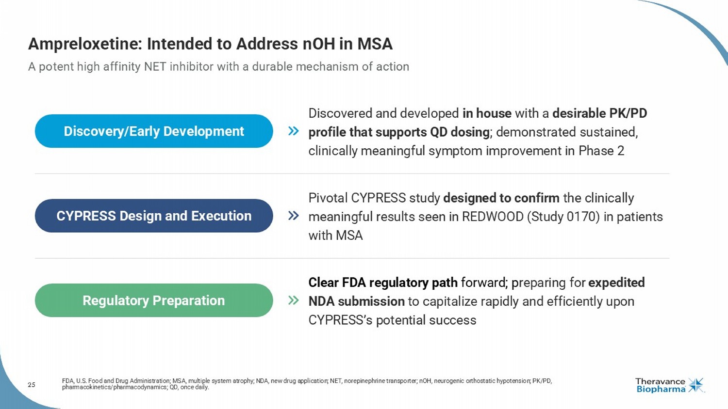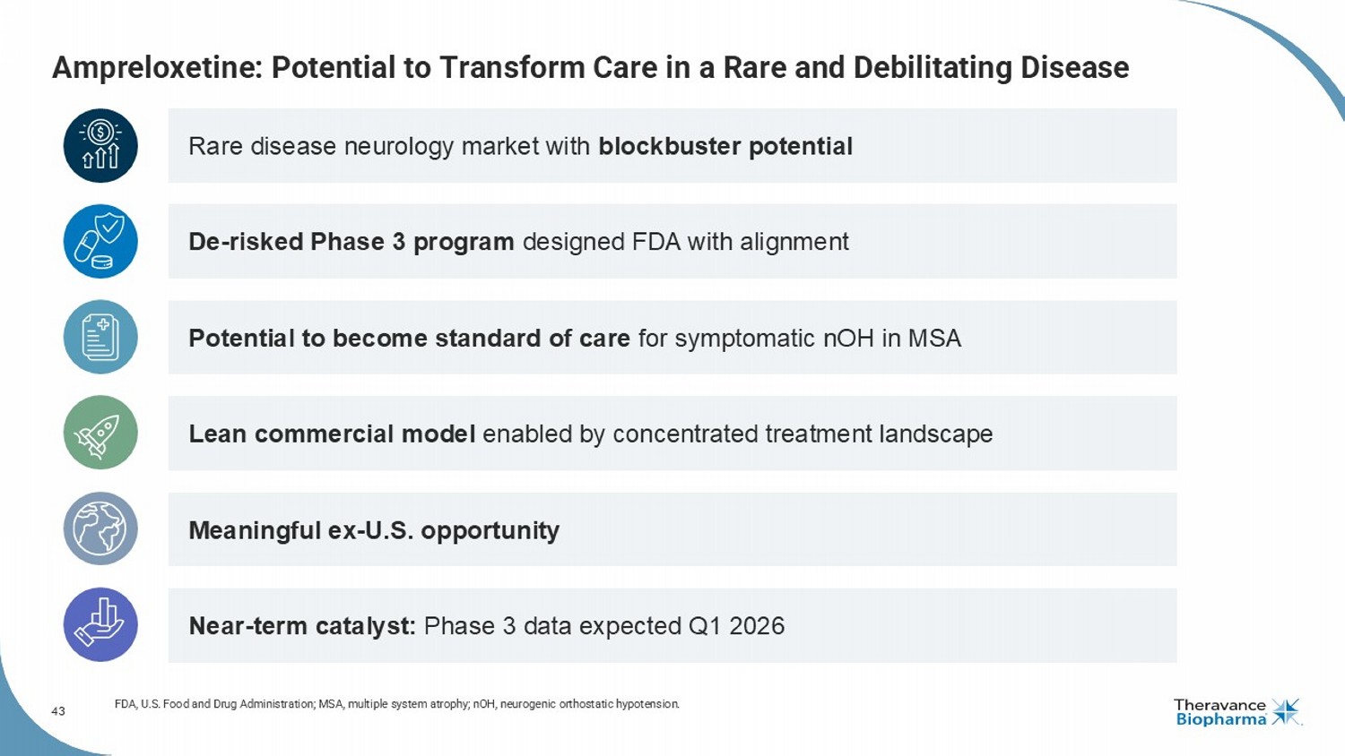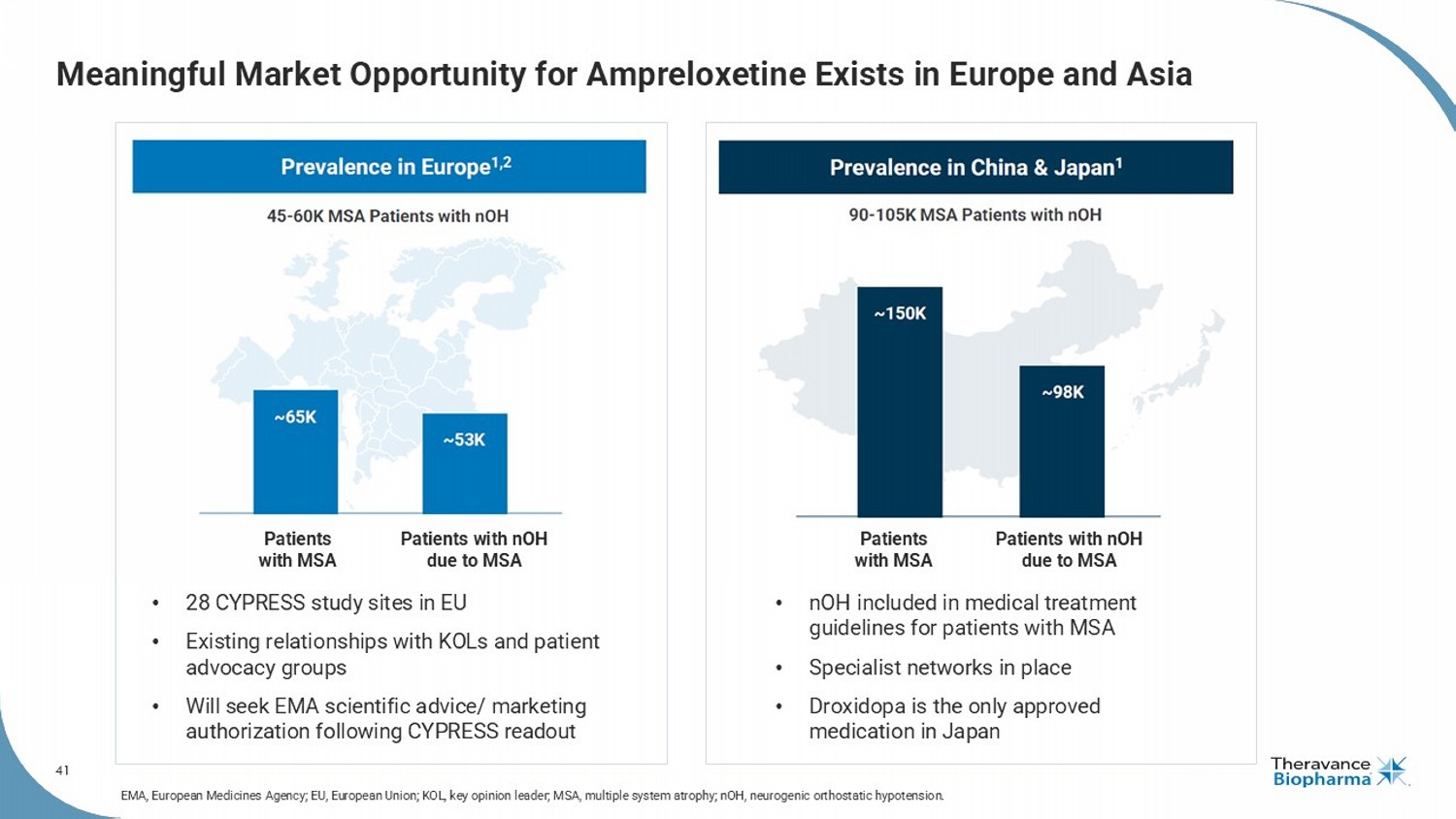 3 Forward Looking Statements This presentation contains certain "forward - looking" statements as that term is defined in the Private Securities Litigation Reform Act of 1995 regarding, among other things, statements relating to goals, plans, objectives, expectations and future events . Theravance Biopharma, Inc . (the “Company” or "Theravance Biopharma") intends such forward - looking statements to be covered by the safe harbor provisions for forward - looking statements contained in Section 21 E of the Securities Exchange Act of 1934 , as amended, and the Private Securities Litigation Reform Act of 1995 . Examples of such statements include statements relating to : the Company’s expectations regarding its future profitability, expenses and uses of cash, the Company’s goals, designs, strategies, plans and objectives, future growth of YUPELRI sales, future royalty or milestone payments, the ability to provide value to shareholders, the Company’s regulatory strategies and timing of clinical studies, possible ultimate safety, efficacy or differentiation of our investigational therapy, commercial opportunities, and expectations around the use of OHSA scores as endpoints for clinical trials . These statements are based on the current estimates and assumptions of the management of Theravance Biopharma as of the date of this press release and the conference call and are subject to risks, uncertainties, changes in circumstances, assumptions and other factors that may cause the actual results of Theravance Biopharma to be materially different from those reflected in the forward - looking statements . Important factors that could cause actual results to differ materially from those indicated by such forward - looking statements include, among others, risks related to : factors that could increase the Company’s cash requirements or expenses beyond its expectations and any factors that could adversely affect its profitability, whether the milestone thresholds can be achieved, delays or difficulties enrolling or completing clinical studies, the potential that results from clinical or non - clinical studies indicate the Company’s product candidates or product are unsafe, ineffective or not differentiated, risks of decisions from regulatory authorities that are unfavorable to the Company, dependence on third parties to conduct clinical studies, delays or failure to achieve and maintain regulatory approvals for product candidates, risks of collaborating with or relying on third parties to discover, develop, manufacture and commercialize products, the results of the patent infringement litigation initiated by the Company and its partner against certain generic companies in federal district courts, and risks associated with establishing and maintaining sales, marketing and distribution capabilities with appropriate technical expertise and supporting infrastructure, the ability of the Company to protect and to enforce its intellectual property rights, volatility and fluctuations in the trading price and volume of the Company’s shares, and general economic and market conditions . Other risks affecting the Company are in the Company’s Form 10 - Q filed with the SEC on November 12 , 2025 , and other periodic reports filed with the SEC . In addition to the risks described above and in Theravance Biopharma's filings with the SEC, other unknown or unpredictable factors also could affect Theravance Biopharma’s results . No forward - looking statements can be guaranteed, and actual results may differ materially from such statements . Given these uncertainties, you should not place undue reliance on these forward - looking statements . Theravance Biopharma assumes no obligation to update its forward - looking statements on account of new information, future events or otherwise, except as required by law . Important Note Ampreloxetine is an investigational product being studied for the treatment of symptomatic neurogenic orthostatic hypotension (nOH) in patients with multiple system atrophy (MSA) . It has not been approved by the FDA or any other regulatory agency in the world and the safety and efficacy of ampreloxetine has not been established . This document is developed to share background information including current landscape of the disease state and stakeholders for purposes of investor communication only . The information are not intended to be promotional or commercial in nature . Per Theravance Biopharma policy, any implementation of commercial strategy or tactic are subject to internal review and approval . Presenting KOL Disclosure Dr . Kaufmann is a member of advisory committees supporting the CYPRESS clinical trial and paid consultant to Theravance Biopharma . The views and opinions expressed by Dr . Kaufmann are his own and do not necessarily reflect the views and opinions of Theravance Biopharma .