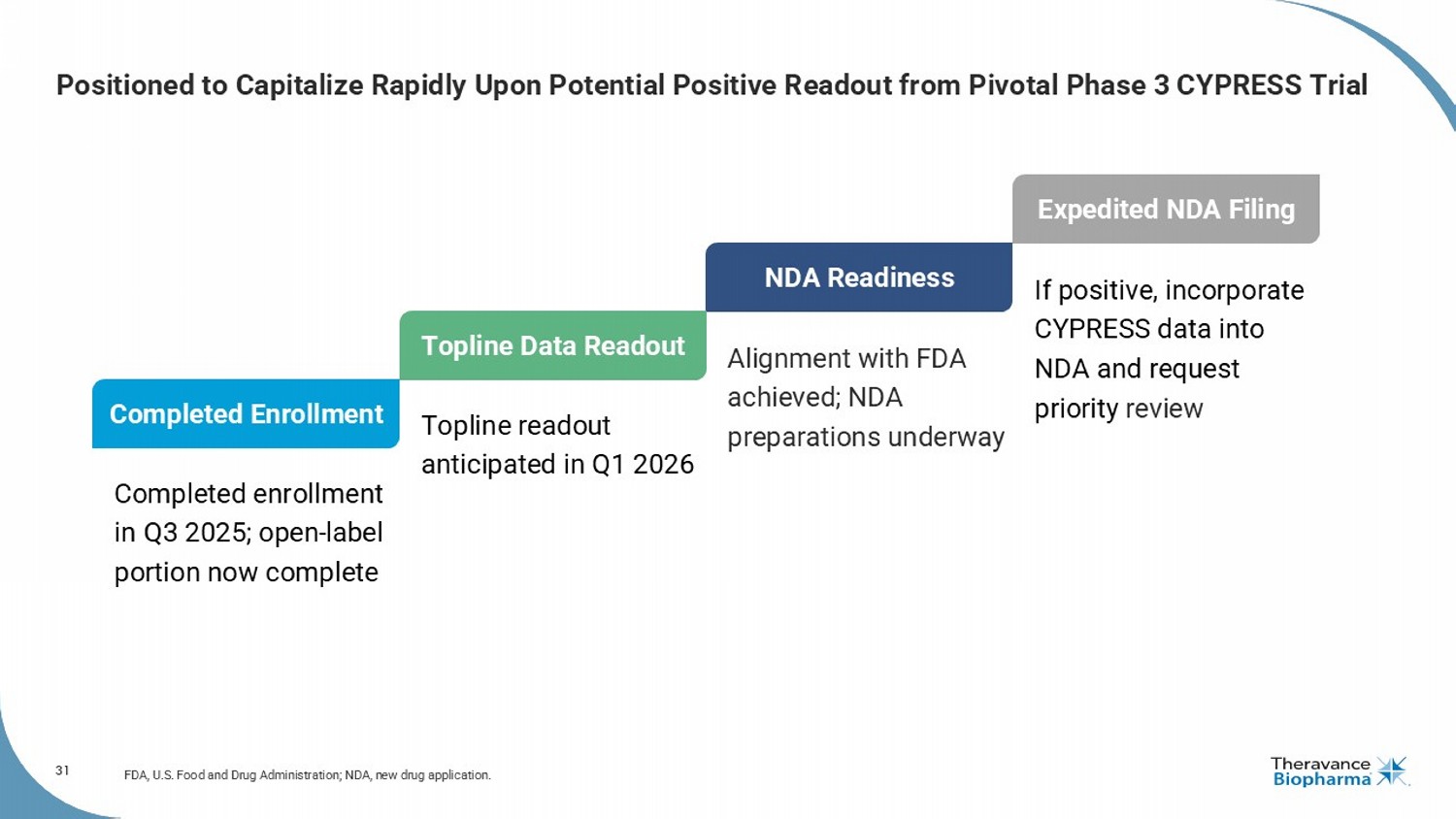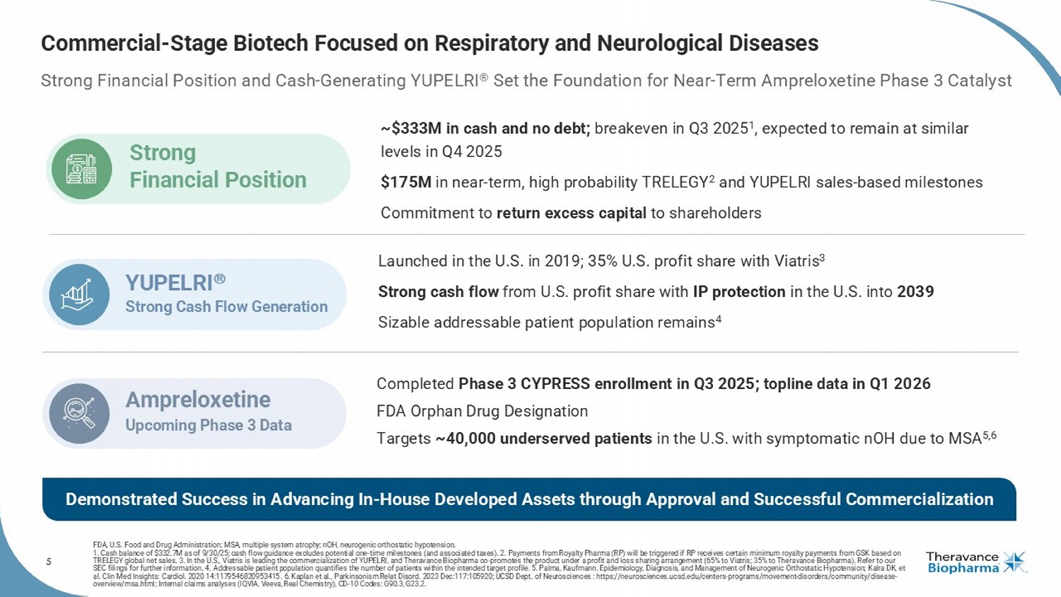 5 Commercial - Stage Biotech Focused on Respiratory and Neurological Diseases Strong Financial Position and Cash - Generating YUPELRI ® Set the Foundation for Near - Term Ampreloxetine Phase 3 Catalyst FDA, U.S. Food and Drug Administration; MSA, multiple system atrophy ; nOH , neurogenic orthostatic hypotension. 1. Cash balance of $332.7M as of 9/30/25; cash flow guidance excludes potential one - time milestones (and associated taxes). 2. P ayments from Royalty Pharma (RP) will be triggered if RP receives certain minimum royalty payments from GSK based on TRELEGY global net sales. 3. In the U.S., Viatris is leading the commercialization of YUPELRI, and Theravance Biopharma co - promotes the product under a profit and loss sharing a rrangement (65% to Viatris ; 35% to Theravance Biopharma). Refer to our SEC filings for further information. 4. Addressable patient population quantifies the number of patients within the intended target profile. 5. Palma, Kaufmann. Epid emi ology, Diagnosis, and Management of Neurogenic Orthostatic Hypotension; Kalra DK, et al. Clin Med Insights: Cardiol . 2020 14:1179546820953415 . 6. Kaplan et al., Parkinsonism Relat Disord . 2023 Dec:117:105920; UCSD Dept. of Neurosciences : https://neurosciences.ucsd.edu/centers - programs/movement - disorders/communit y/disease - overview/msa.html; Internal claims analyses (IQVIA, Veeva, Real Chemistry), CD - 10 Codes: G90.3, G23.2. Completed Phase 3 CYPRESS enrollment in Q3 2025; topline data in Q1 2026 FDA Orphan Drug Designation Targets ~40,000 underserved patients in the U.S. with symptomatic nOH due to MSA 5,6 Ampreloxetine Upcoming Phase 3 Data Launched in the U.S. in 2019; 35% U.S. profit share with Viatris 3 Strong cash flow from U.S. profit share with IP protection in the U.S. into 2039 Sizable addressable patient population remains 4 YUPELRI Strong Cash Flow Generation ~$333M in cash and no debt; breakeven in Q3 2025 1 , expected to remain at similar levels in Q4 2025 $175M in near - term, high probability TRELEGY 2 and YUPELRI sales - based milestones Commitment to return excess capital to shareholders Strong Financial Position Demonstrated Success in Advancing In - House Developed Assets through Approval and Successful Commercialization